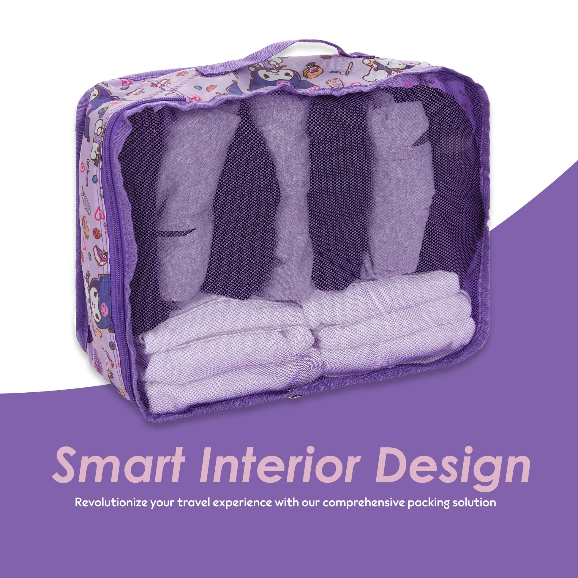 - Adorable Sanrio Design & Versatile Use: Our 5-piece packing cube set features beloved Sanrio characters Hello Kitty, My Melody, Kuromi, and Keroppi. Includes X-Large (17.5 x 13 x 4), Large (15.5 x 12 x 4), Medium (13 x 10 x 4), Small (8.5 x 12 x 4), and Flat Pouch (8 x 6 x 3) sizes. Perfect for organizing suitcases, backpacks, duffel bags, and closets. Ideal for family vacations, cruises, weekend getaways, or business trips. These cute, colorful cubes make packing fun for kids, and adults alike.