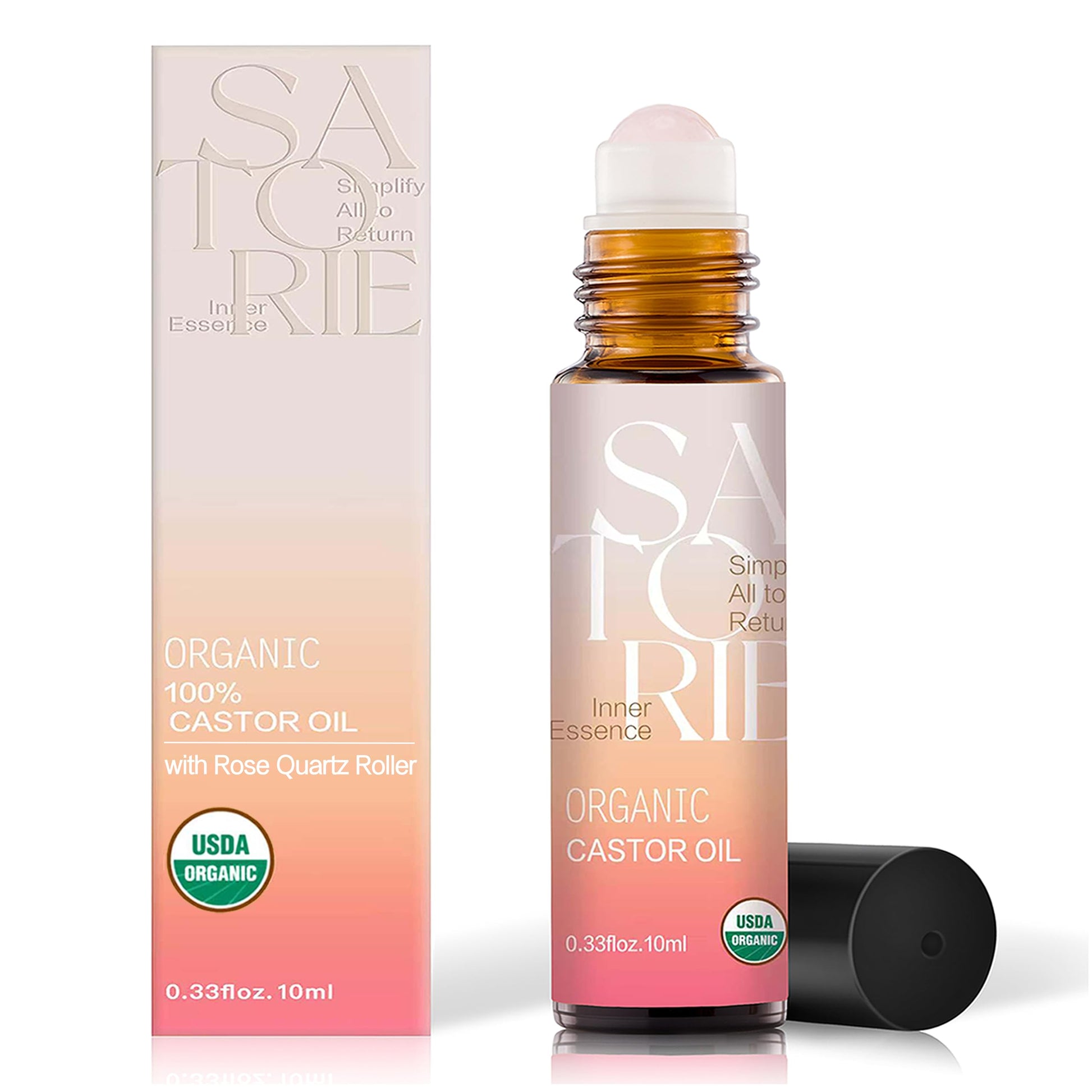 SATORIE Organic Castor Oil with Rose Quartz Rollerball - USDA Certified 100% Castor Oil Roll-on for Face, Under Eyes, Brows & Lashes; Deep Moisture, Soothing, Promotes Hair Growth