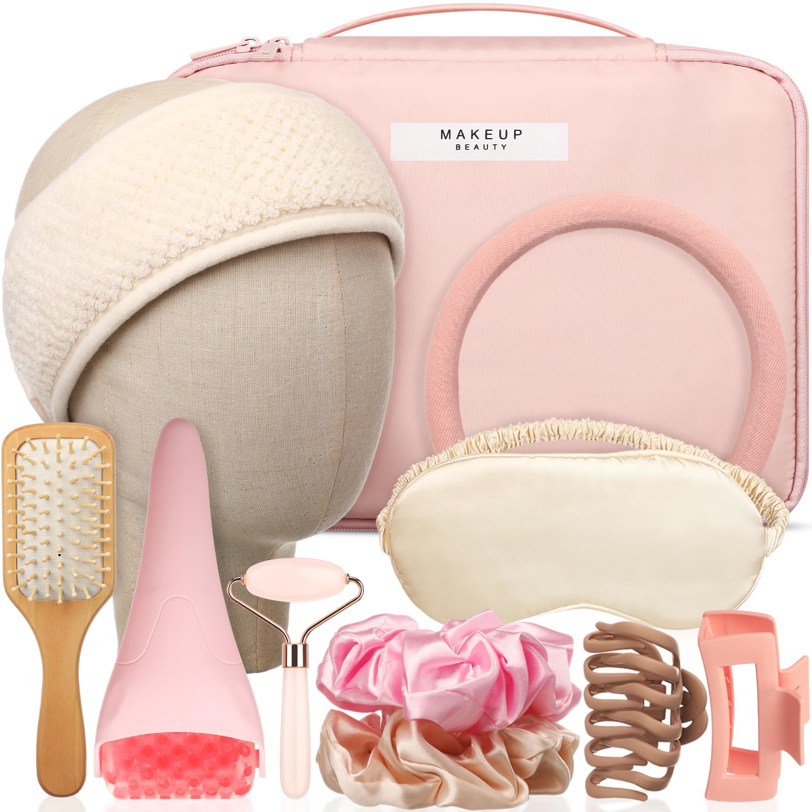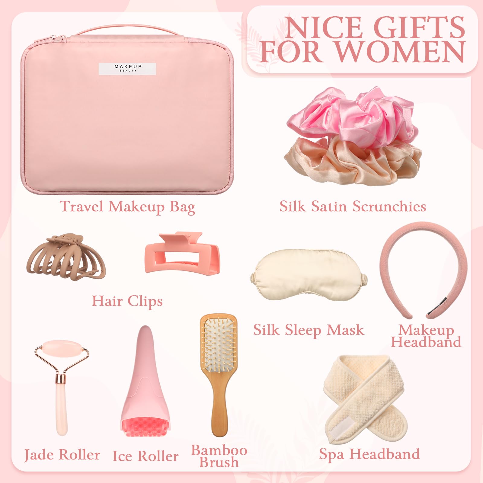 - Girls Birthday Gifts Ideas: this is a birthday gift basket that will surprise the recipient; The set includes 1 large pink cosmetic bag, 1 face ice roller, 1 single-head facial roller, 1 square massage comb, 1 elastic band eye mask, 2 hair clips, 1 spa headband, 1 silk sponge headband, 2 hair scrunchies; These products can meet diverse haircare needs, making your haircare routine more efficient and easy