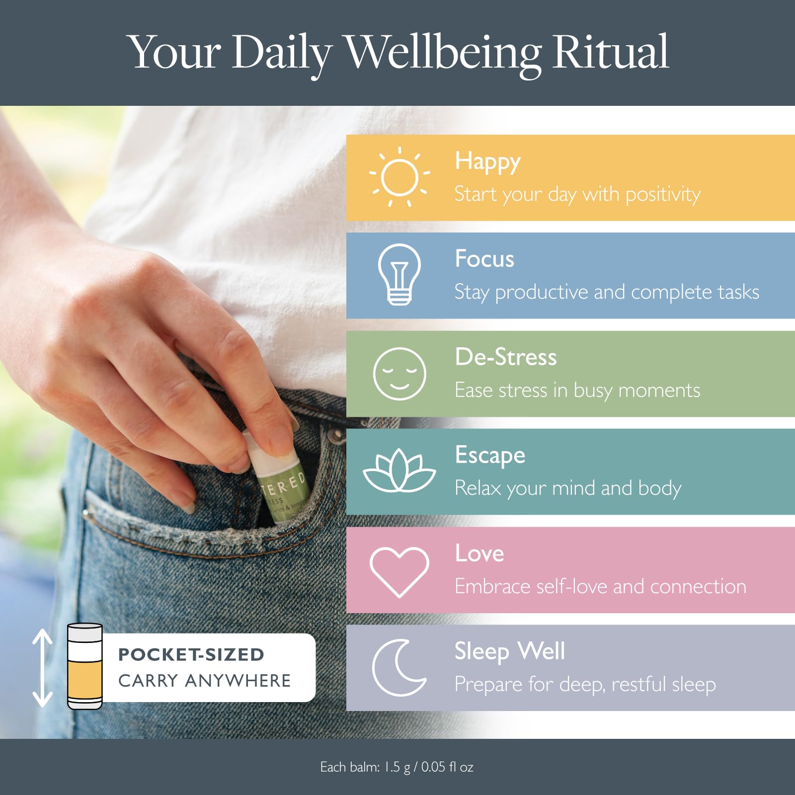 - Six Unique Balms for Every Moment – Includes mini versions of our signature balms: 'Sleep Well' for restful sleep, 'De-Stress' for relaxation, 'Focus' for mental clarity, 'Escape' for mindfulness, 'Happy' to uplift your mood, and 'Love' for emotional balance and support. Each balm functions as a compact essential oil inhaler and aromatherapy pen with soothing scents.