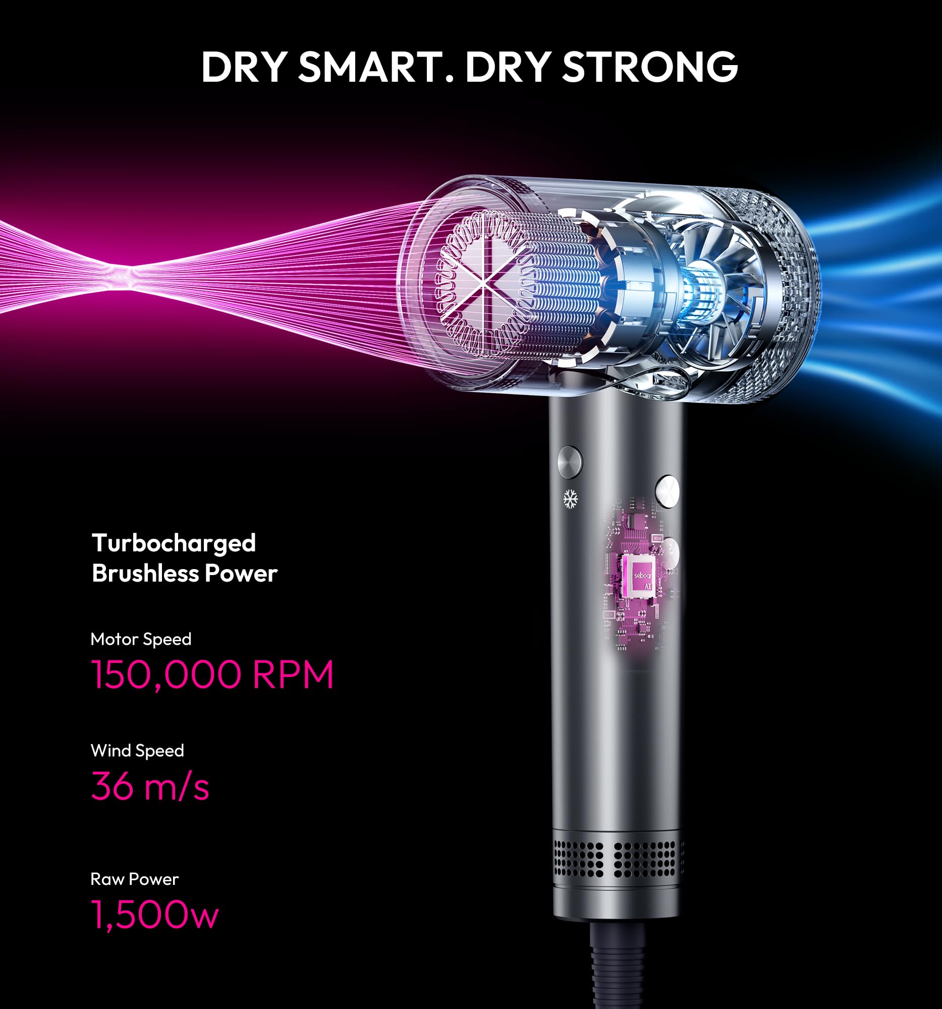 - Fast Drying in Under 3 Minutes: Dry your hair before coffee’s ready. The 150,000 RPM motor and 36m/s turbo airflow dry even thick hair in under 3 minutes—perfect for busy mornings, gym-goers, and quick touch-ups