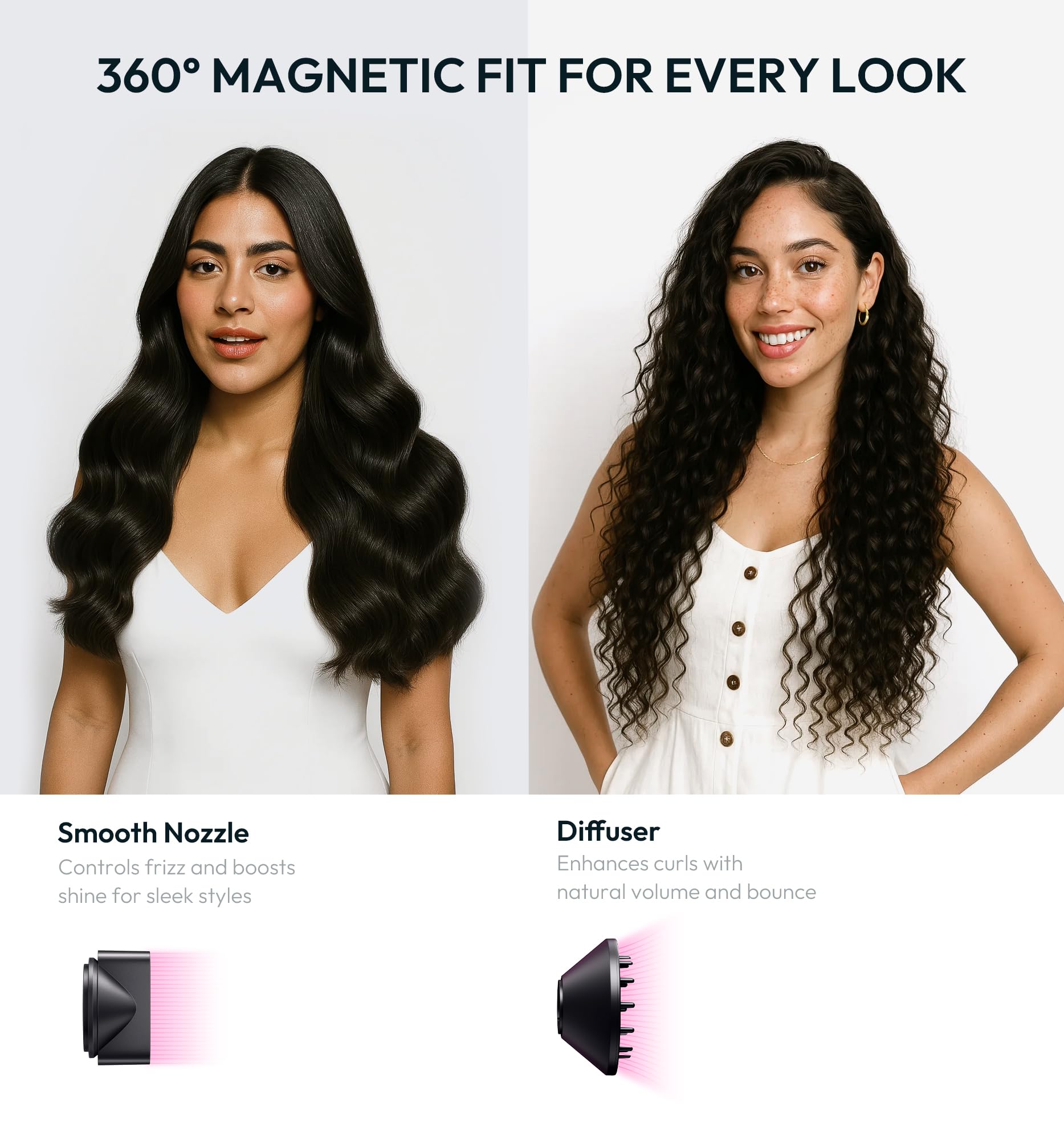 - Magnetic Attachments and Travel-Ready: The Seboar hair dryer comes with two magnetic attachments—a smoothing nozzle and a diffuser. Compact and lightweight, it easily fits into any bag for busy travelers and on-the-go styling. A built-in hanging hook makes storage simple and convenient after each use.