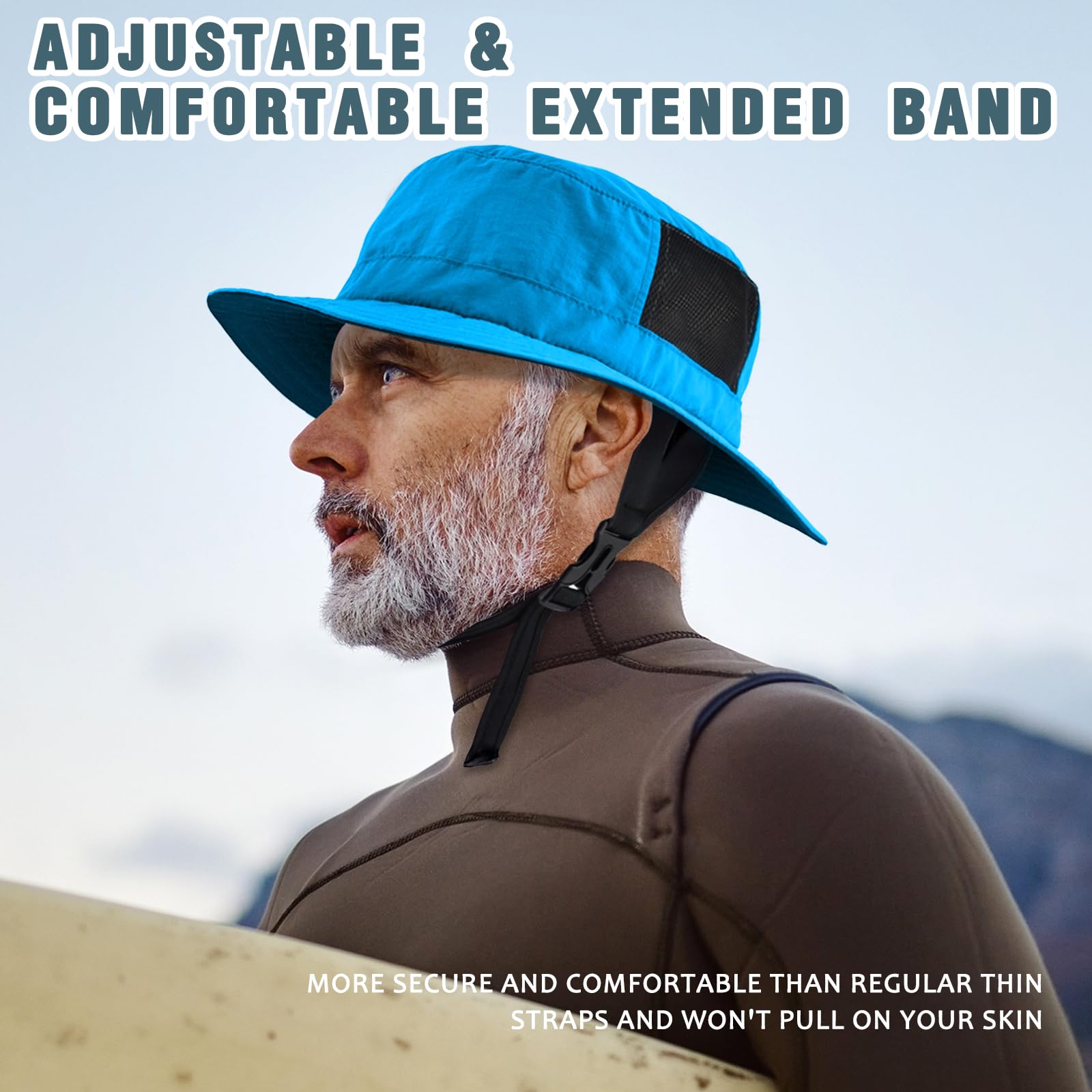 - Reinforced Windproof:: The surfing bucket hat design with adjustable widened chin strap and strong stitching to ensure that the cap stays in place and that it doesn't fall off during exercise.