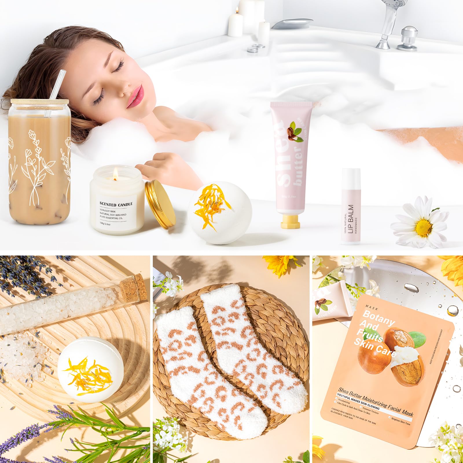 - Self Care Gifts for Women: This care package for women is the ultimate way to convey love and care, contains everything she needs to relax and pamper: 1*16oz coffee glass cup, 1*shea butter hand lotion, 1*100g scented candle, 1*bath salt, 1*bath bomb, 1*nourishing sheet mask, 1*lip balm,1 pair of leopard socks and 1*greeting card. Such a heart-warming thinking of you gifts for women are designed to bring comfort, stress relief and enjoy a cozy & leisure time