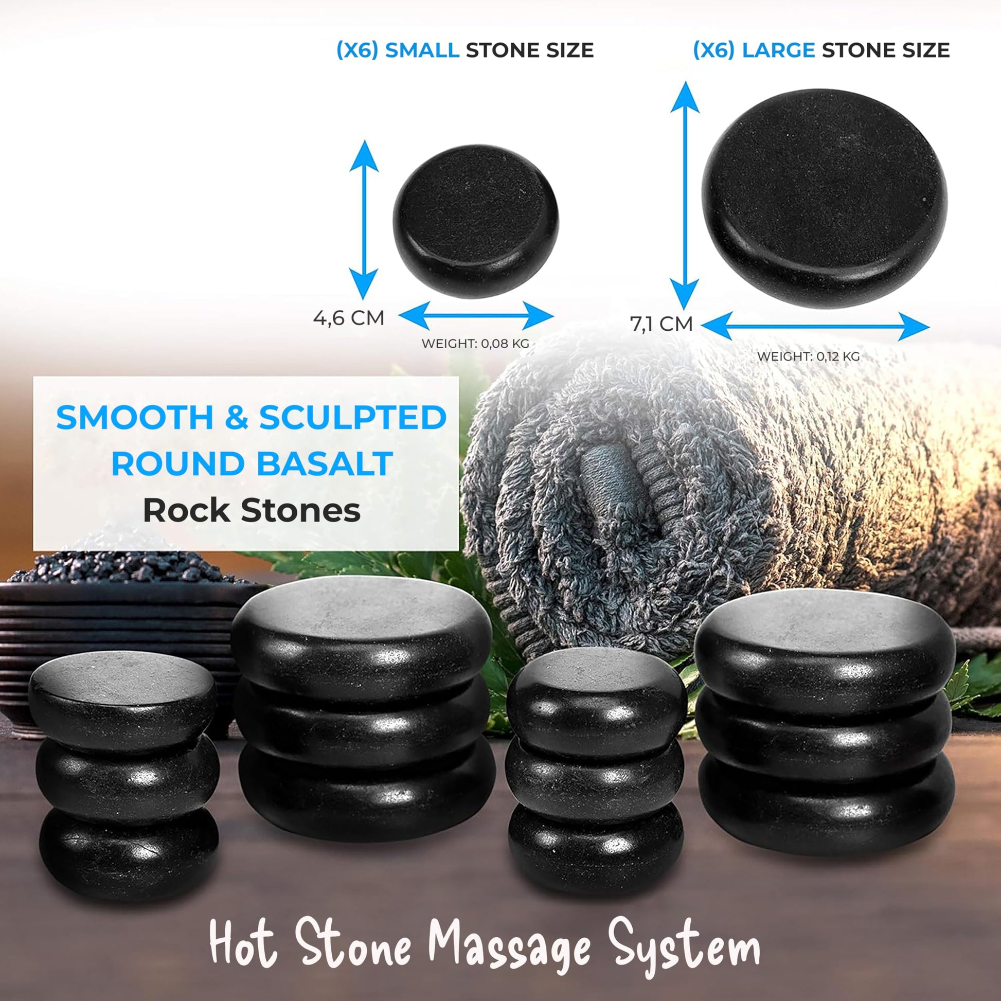 - 12 BASALT VOLCANIC STONES: This hot stone massage kit rock therapy system features 6 large and 6 small smooth round-shaped natural black basalt rock with high silica and iron content that can hold heat for 25-35 mins which is longer than most stones