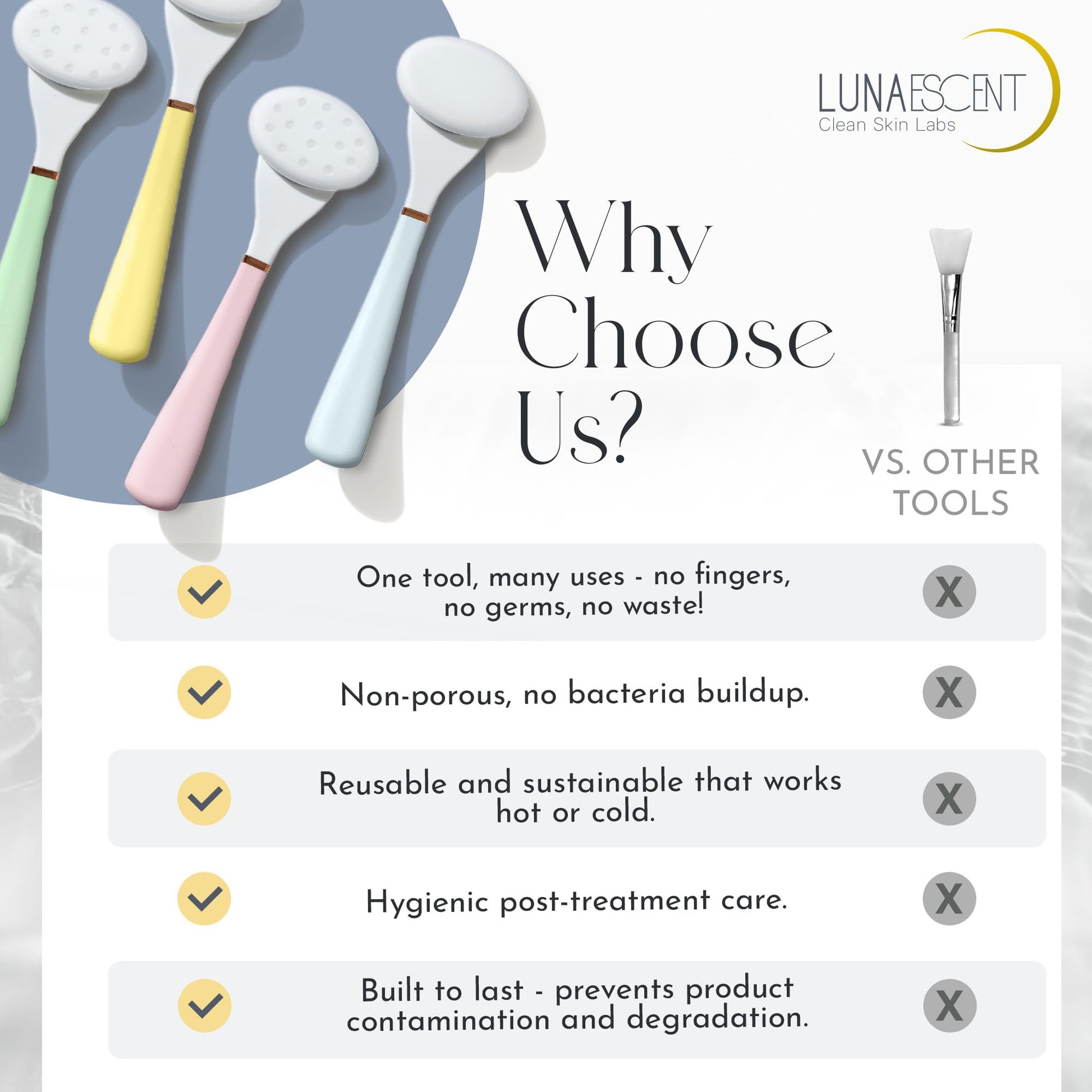 - PLATINUM GRADE SILICONE FOR HYGIENE & MINIMAL WASTE – Made from high-quality, non-porous silicone, this face applicator tool prevents waste through absorption into fingers, ensuring maximum use of your skincare products. Its hygienic design makes it a safer alternative to traditional stone tools and silicone face mask brush. Whether using it for skincare, sunscreen, makeup, or medication and ointments, LUNAESCENT offers a versatile, practical solution for your beauty and health needs.