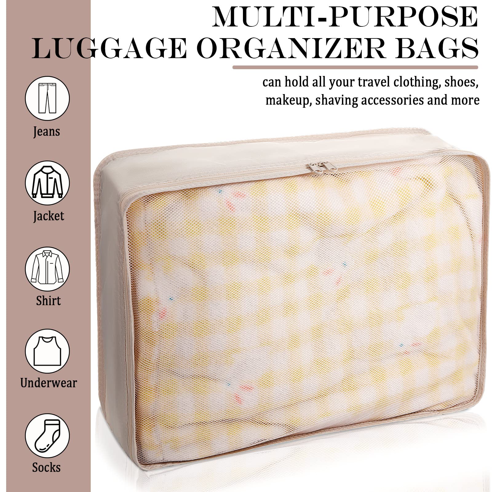 - Save Your Luggage Space: large interior volume holds all your travel clothing, shoes, makeup, shaving accessories and more; Multiple mesh bags to organize and separate your item, smooth material ensures that your clothes don't get creased