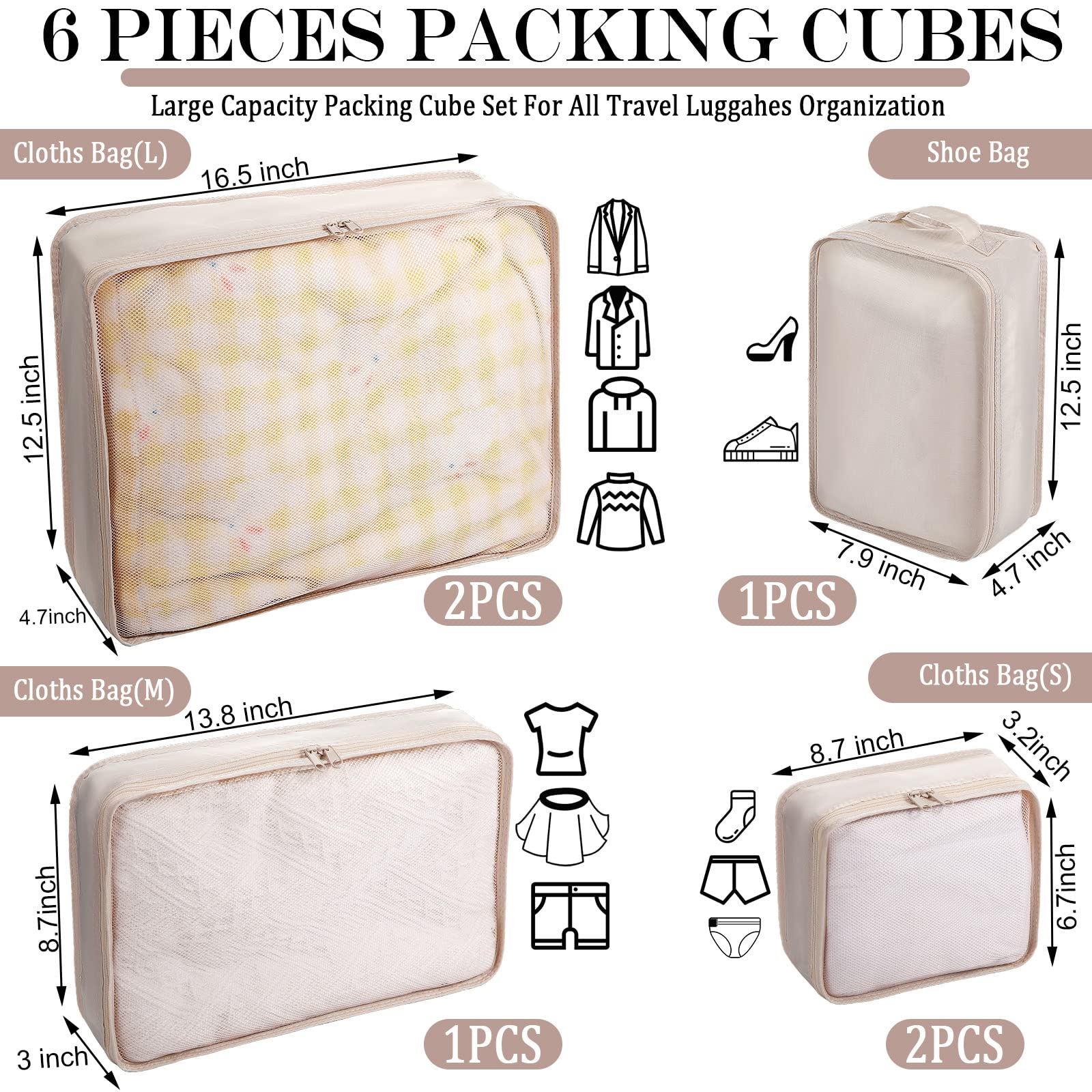 Details: Features: The packing organizer bags can help to organize your luggage and save your luggage space. Specifications: Material: nylon fabric Color: blue and beige Size: Large Cubes: 16.5 x 12.5 x 4.7 inches Medium Cubes: 13.8 x 8.7 x 3 inches Small Cubes: 8.7 x 6.7 x 3.2 inches Shoe Bag: 12.5 x 7.9 x 4.7 inches Package includes: 4 x Large packing cubes 2 x Medium packing cubes 4 x Small packing cubes 2 x Double-layer shoe bags Notes: Manual measurement, please allow slight errors on size. The color may exist a slight difference due to different screen displays.