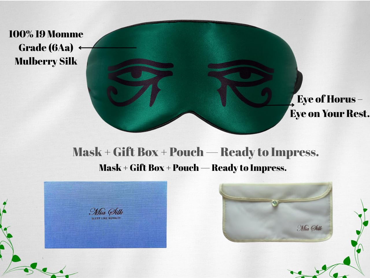 Silk Sleeping Mask Eye Cover for Men&Women Eye Masks for Sleeping Egyptian Eye of Horus Print Adjustable Soft Blindfold with Gift Box(Emerald Green-Adjustable Strap)