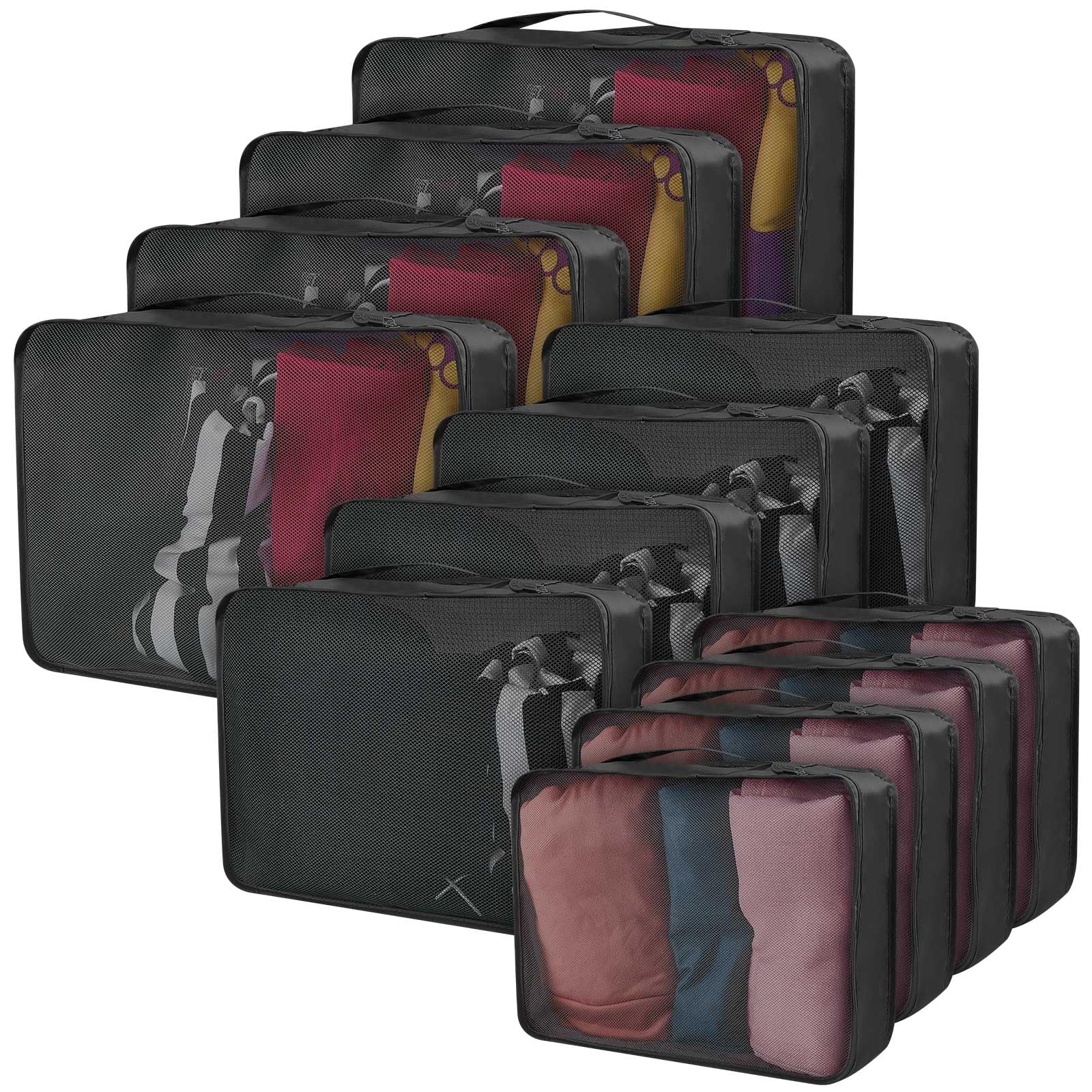 Silkfly 12 Pcs Packing Cubes for Suitcase Travel Luggage Bags Bulk Mesh Organizer Set for Hiking Camping Backpacking Clothes Accessories (Black,XL, L, M Size)
