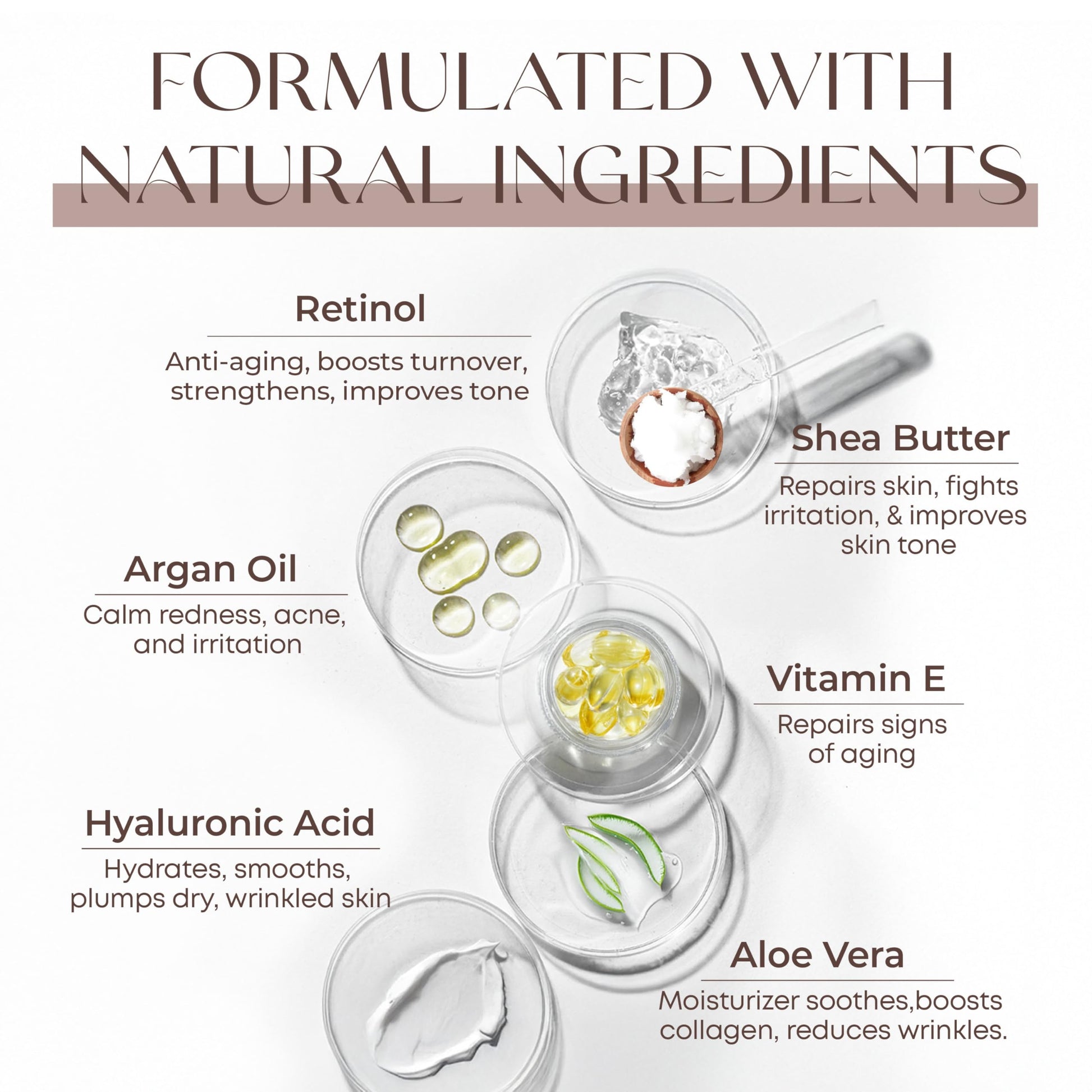 - KEY INGREDIENTS: Retinol, a powerful form of Vitamin A, helps stimulate collagen production, reducing the signs of aging and promoting a firm and smooth complexion. Vitamin E provides antioxidant protection, shielding the skin from environmental damage.