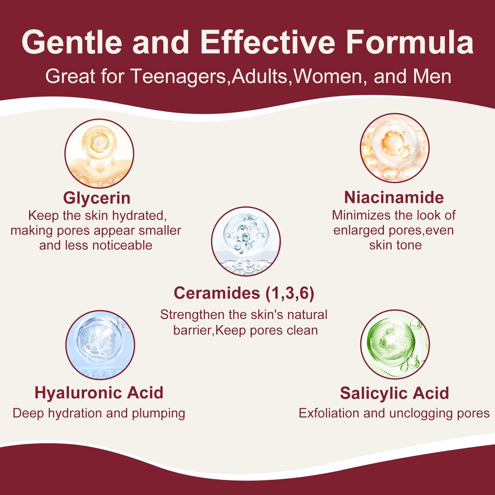 - Effective Ingredients: Powered with Hyaluronic Acid,Salicylic Acid,3 Ceramides,and Glycerin,Our sulfate free skincare products provide hydration without causing dryness,exfoliate and clear pores finally refine pores and even skin tone for a clearer,hydrated look