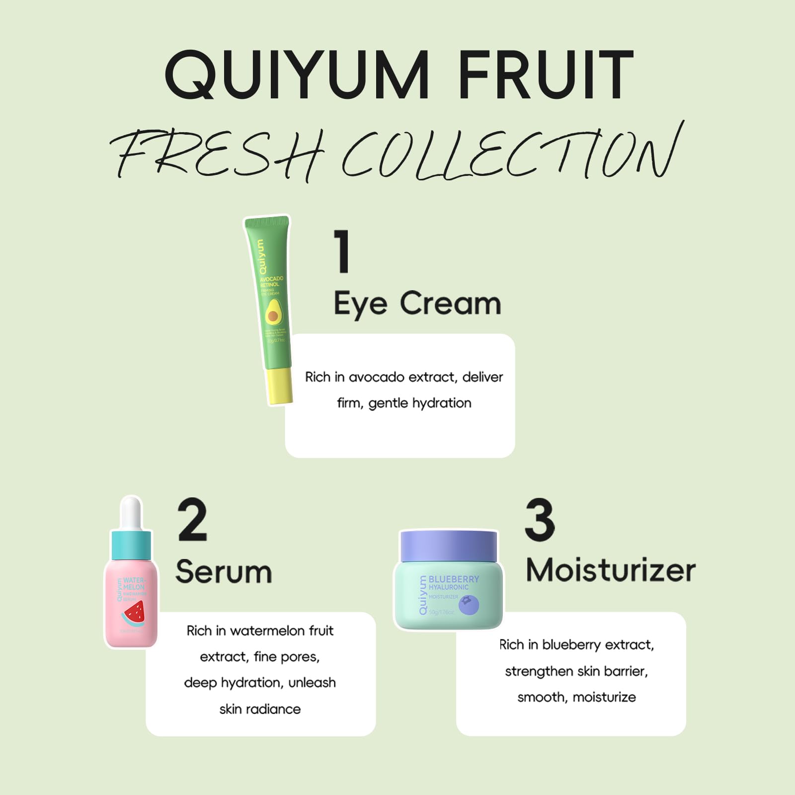 - đEasier 3-Step Skincare Routine - Discover your new skincare essentials with the QUIYUM Care Skincare Set. This 3-in-1 set includes Watermelon Serum 1.01 fl oz, Avocado Eye Cream 0.71oz and Blueberry Moisturizing Face Cream 1.76 oz. Perfect for beginners and those who want to update their daily skincare routine, this set provides a simple daily care solution.