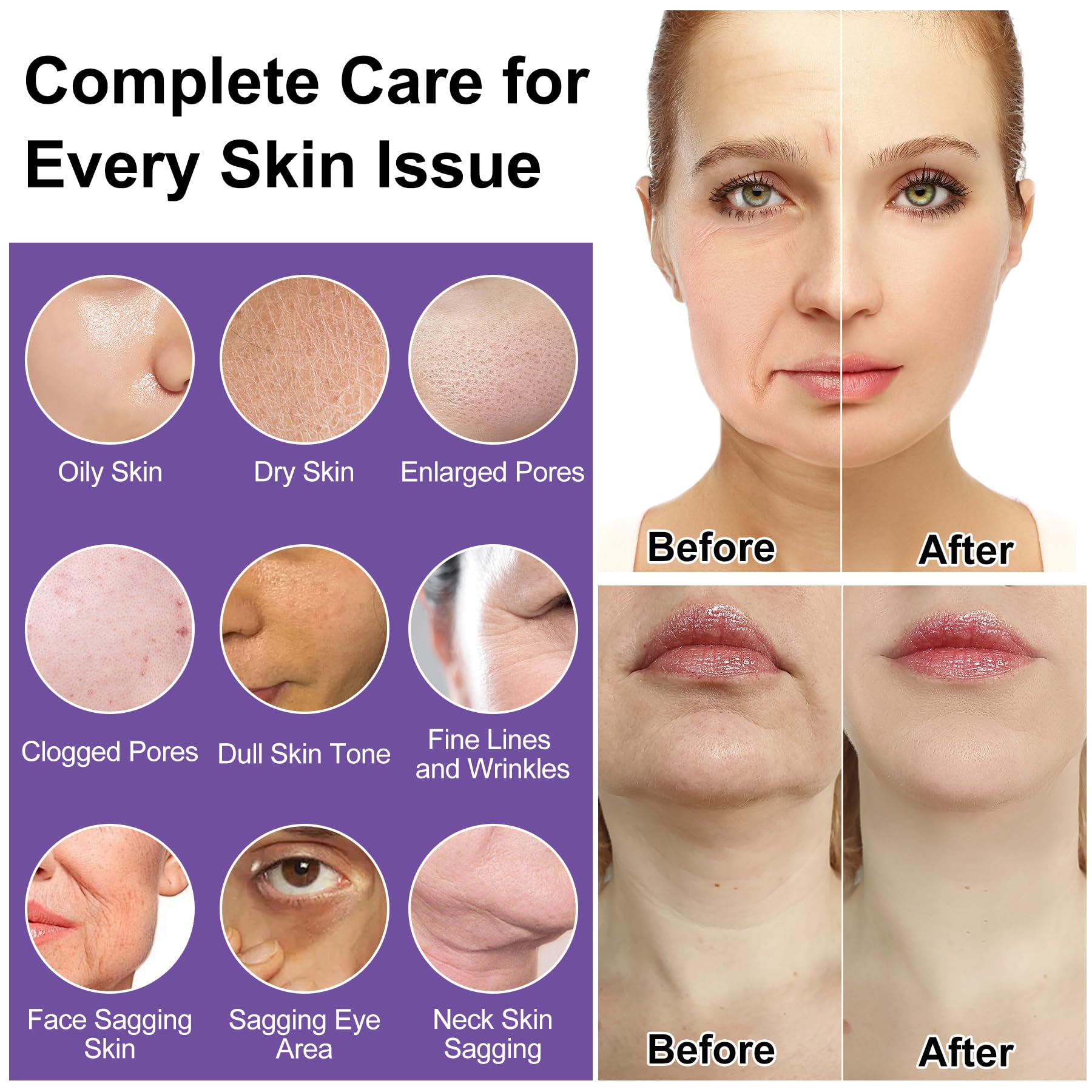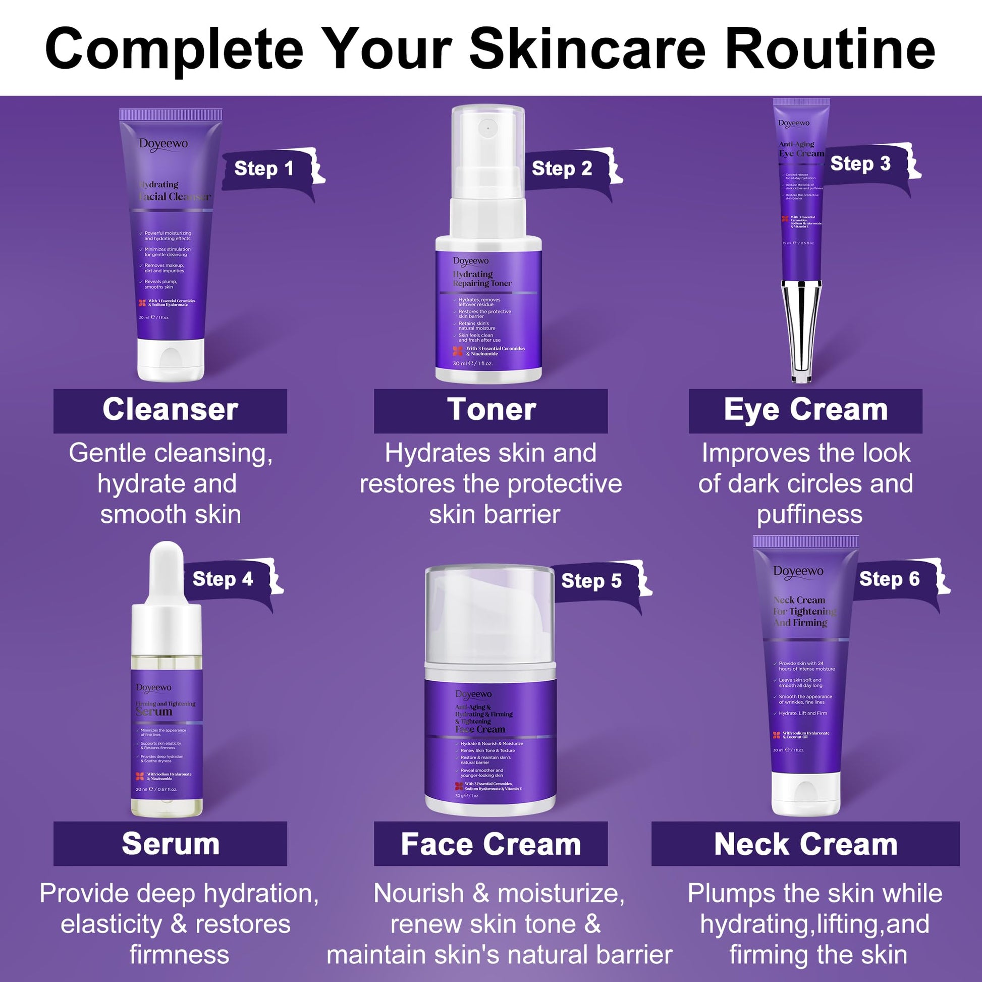 - Your Skin Care Routine Kit: This skin care kit includes everything needed for younger-looking skin.Featuring a facial cleanser,toner,eye cream,serum,face cream and neck cream.Your all-in-one skincare set for controlling oil,hydrating,moisturizing,tightening pores,smoothing,repairing,firming,lifting and anti-aging