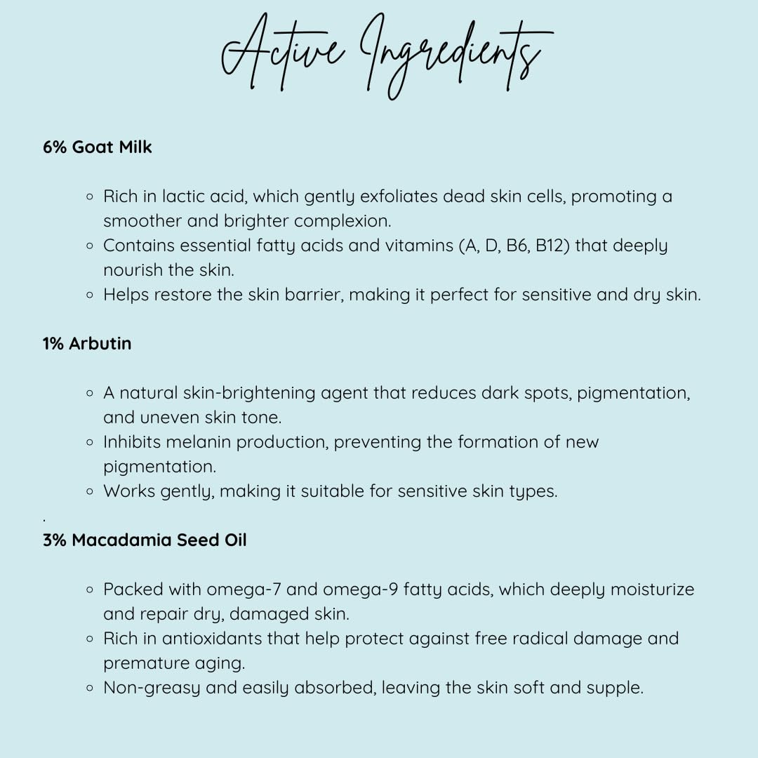 - Gentle Exfoliation: Lactic acid from goat milk gently lifts away dull surface cells, revealing fresher-looking skin.