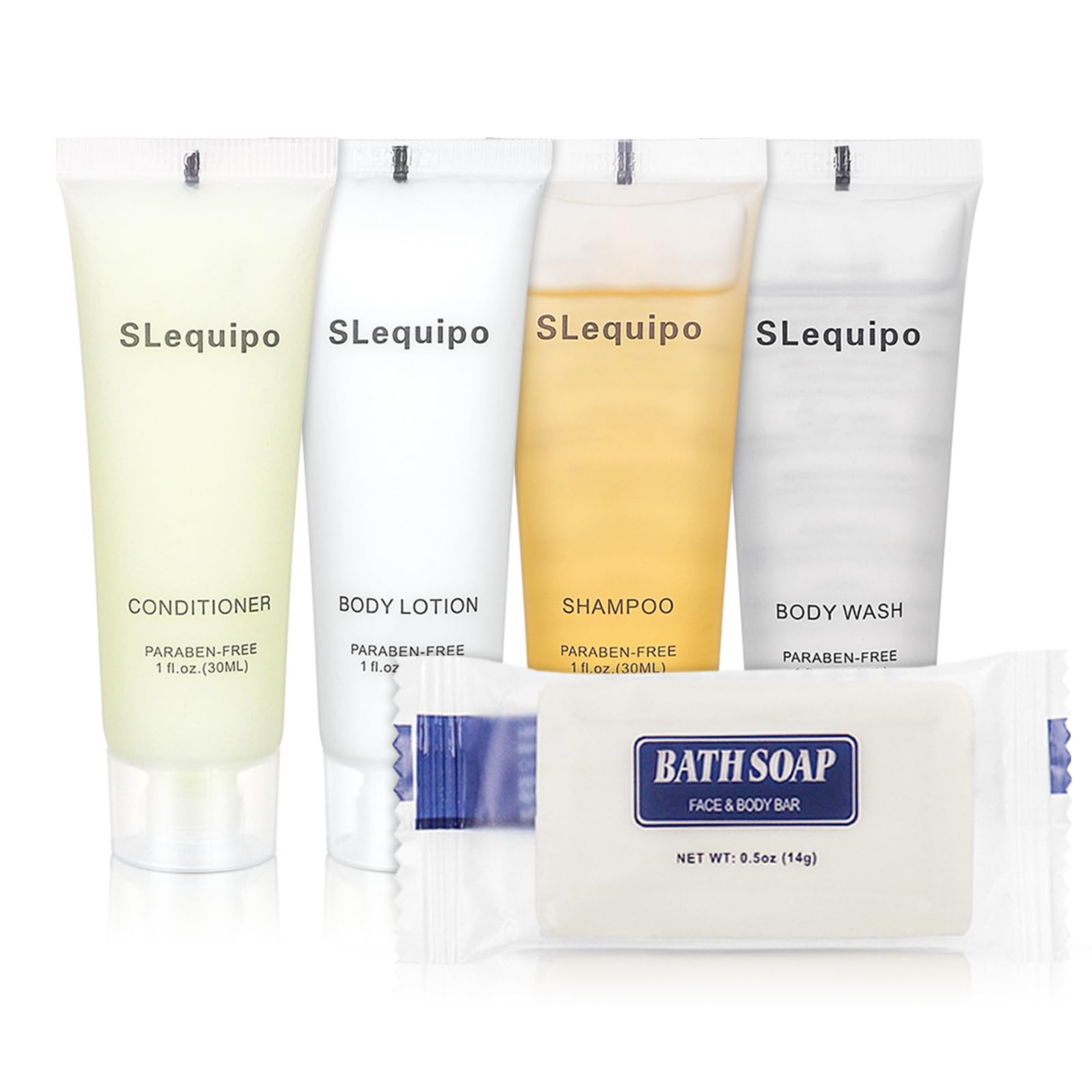 SLequipo 5-IN-1 Hotel Soaps and Toiletries Bulk Set, Hotel Toiletries (100Pcs) 5-Piece Set: 20 Bar Soap 0.5oz, 20 Shampoo, 20 Body Wash, 20 Body Lotion, 20 Conditioner - Mini Guest Toiletries Bulk