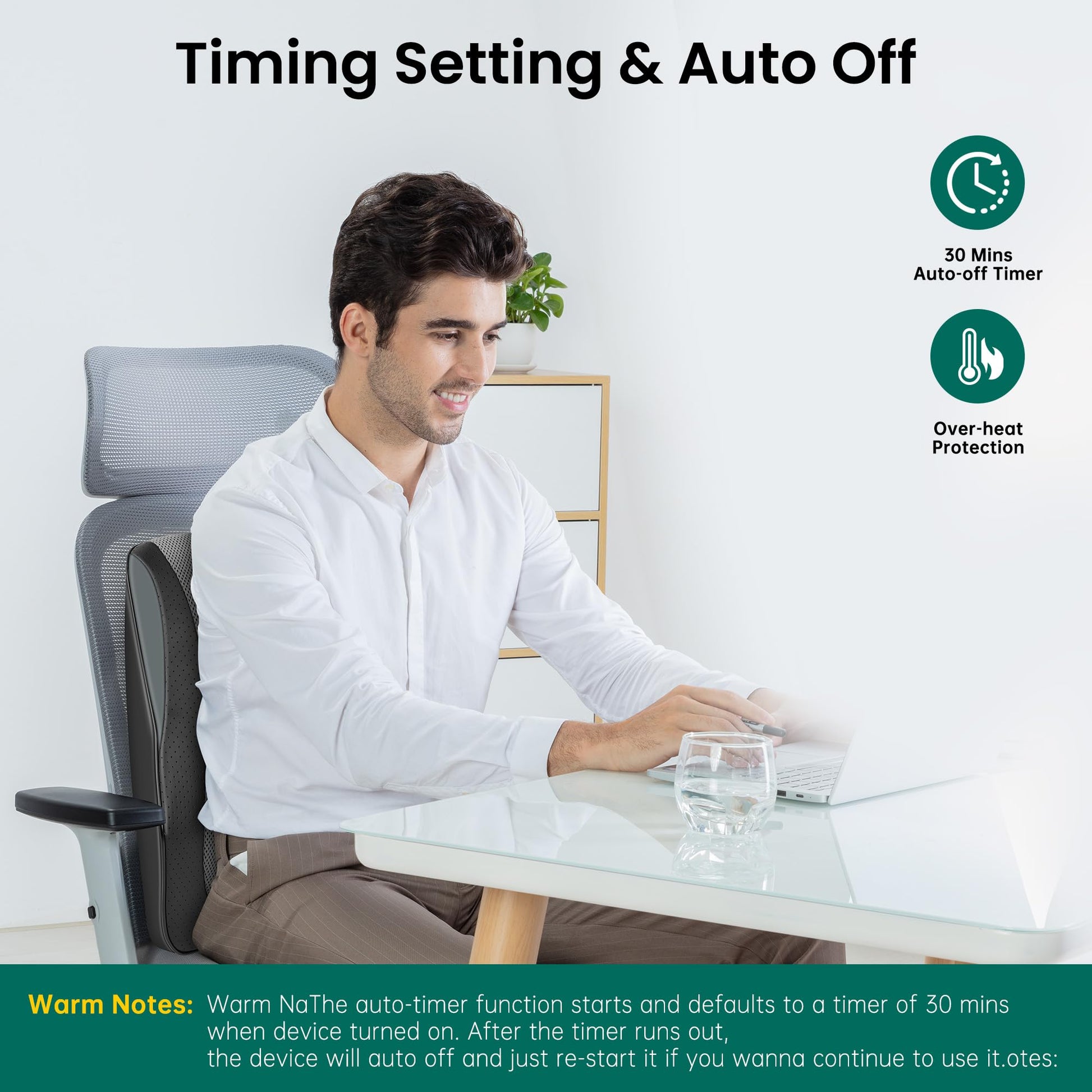 - 30 Mins Timer: The shiatsu back massager has 30 mins auto off timer, and the device will auto off when the timer runs out. If you wanna continue to use it, you need to restart the device by pressing the “power” button.