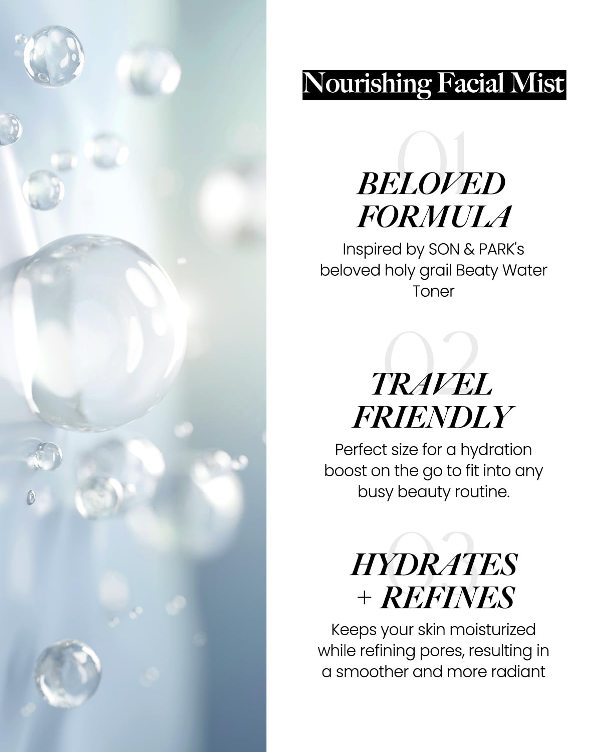 - 🌟 Travel-Friendly Beauty: The SON&PARK Beauty Water Mist is your perfect travel companion, designed for on-the-go hydration and skin revitalization.