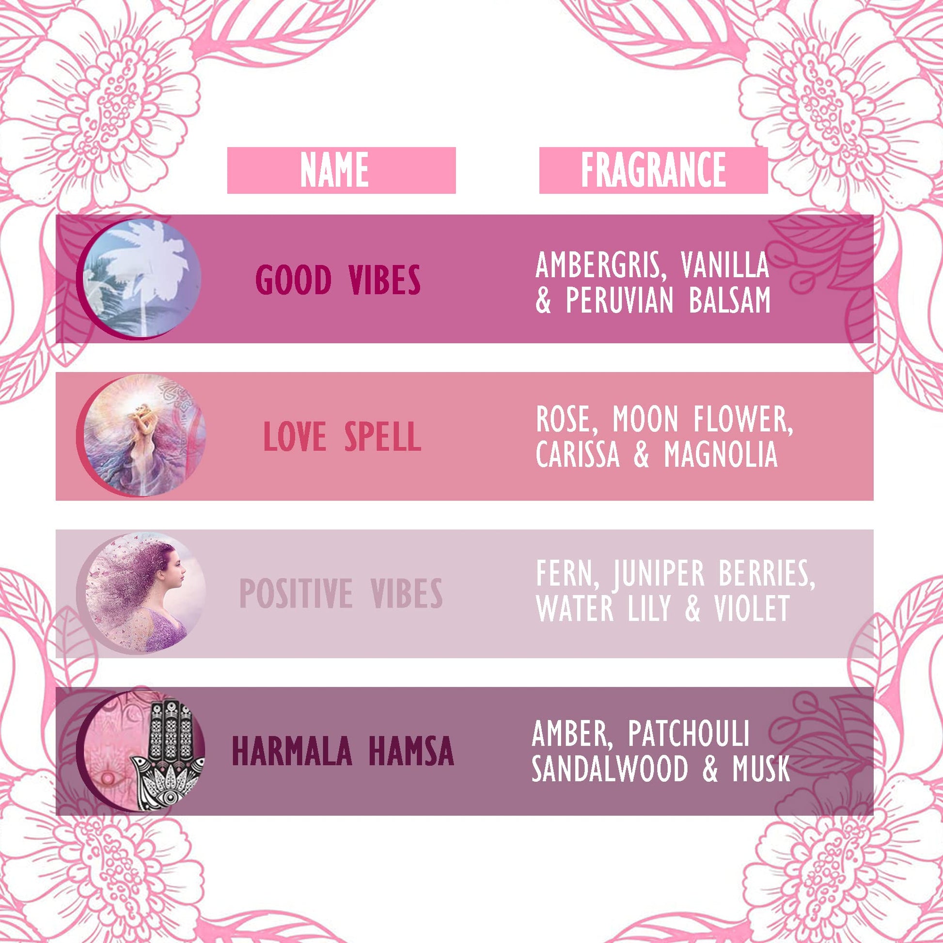 - PEACE AND LOVE: 4 pack includes Good Vibes, Love Spell, Positive Vibes and Harmala Hamsa.
