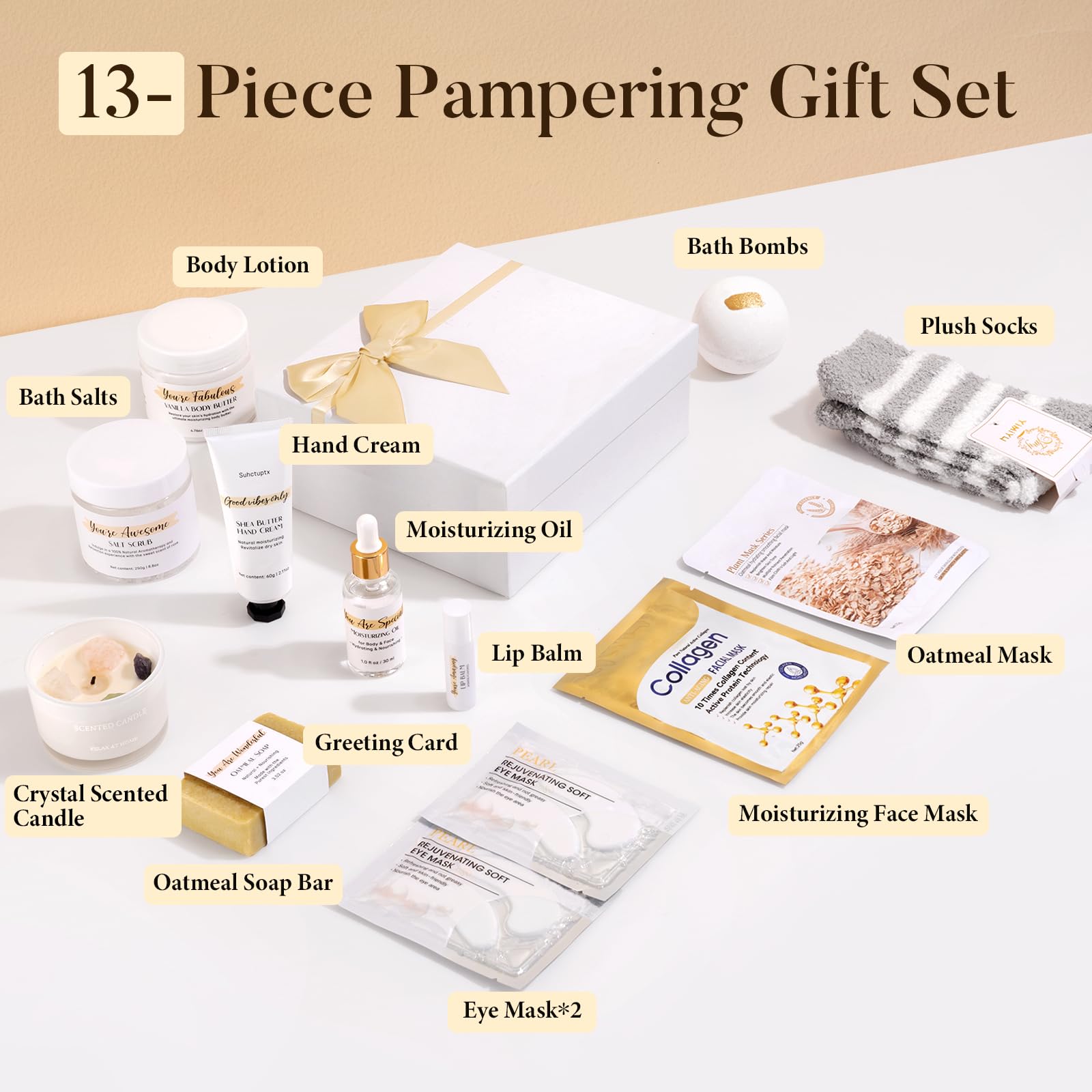 - 【UNIQUE SPA GIFTS FOR WOMEN】This beauty & bath spa kits is the perfect gift to remind the women in your life to pamper themselves every day, including: (1) Crystal Scented Candle | (2) Moisturizing Face Mask | (3) Oatmeal Mask | (4) Eye Mask*2 | (5) Moisturizing Oil | (6) Hand Cream | (7) Lip Balm | (8) Body Lotion | (9) Oatmeal Soap Bar | (10) Bath Salts | (11) Bath Bombs | (12) Plush Socks | (13) Greeting Card - Enjoy the ultimate self care spa experience at home!