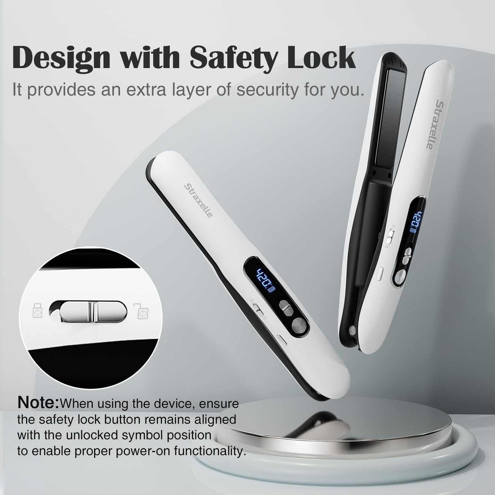 - 【Intuitive Safety Lock Design】Side-mounted child lock must be slid to the "unlocked" position to activate power,to prevent accidental activation. ⚠️ NOTE:When the cordless flat iron is in the locked state, power cannot be turned on and used.