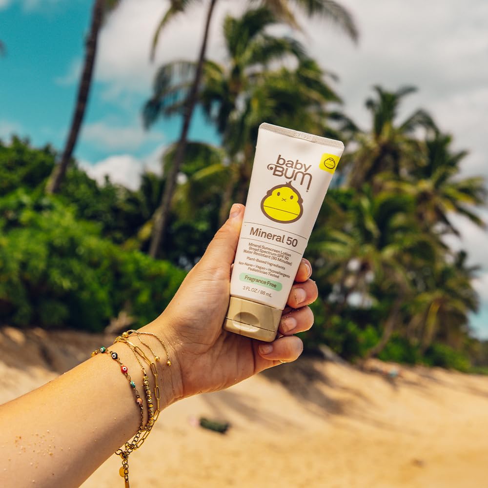 - BABY BUM SPF 50 SUNSCREEN LOTION. Our convenient, travel sized sunscreen is 100% mineral based protection for your little ones. The lotion applies and absorbs easily to face and body with a non-oily feel for UVA/UVB protection. Fit this mini size in your carry-on for your next sunny vacation.