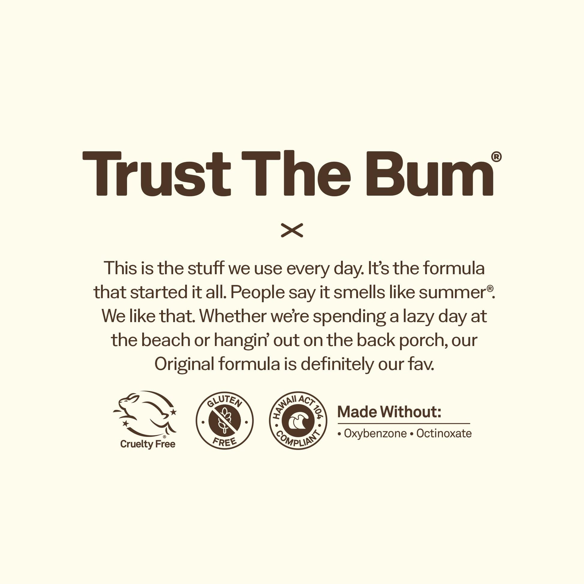 Details: TRUST THE BUM. What does that mean? It means trust us, the ones who live on the beach and need products that work on the most intense days in the sun. The simple truth is, when you make products to protect the ones you love, you make ‘em better.