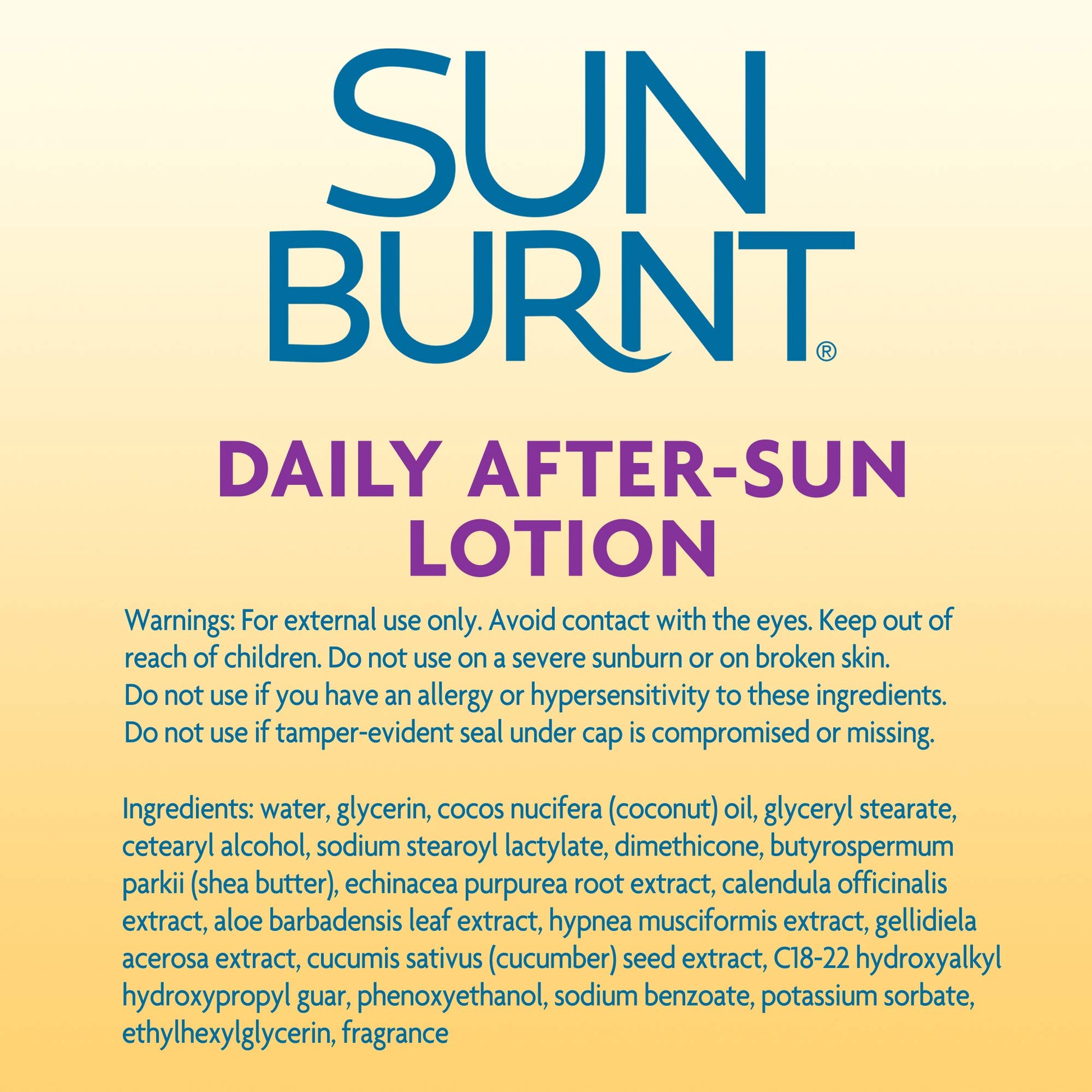 Details: INDICATION:SunBurnt Daily After Sun Lotion is infused with a nourishing blend of botanicals that immediately cools, soothes and moisturizes skin. This hydrating lotion provides soothing relief for hot, dry skin, making it a great way to cool down and recover after a long day in the sun. SunBurnt lotion also contains coconut oil, cucumber and algae extract, anti-oxidant ingredients that help eliminate free radicals. SunBurnt absorbs without feeling greasy like many other after sun cream