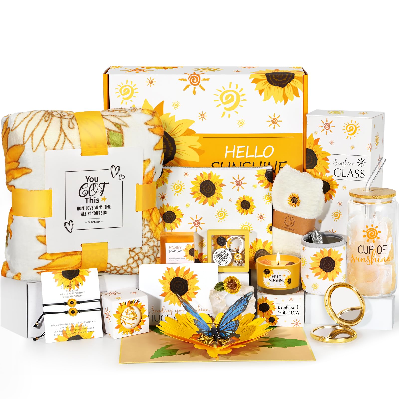 - LUXURY CARE PACKAGE FOR WOMEN: At Suhctuptx, we offer luxurious, unique gifts for women, and this sunflower gift is the perfect blend of elegance and practicality - Best Christmas Gifts for Women & Birthday Gifts! It has everything she really needs, 15pcs carefully designed gift contents - soft inspirational sunflower blanket, sparkling glass, bright candle and floral scented toiletries. How can anyone not smile when they receive this bright yellow box filled with wonderful things?