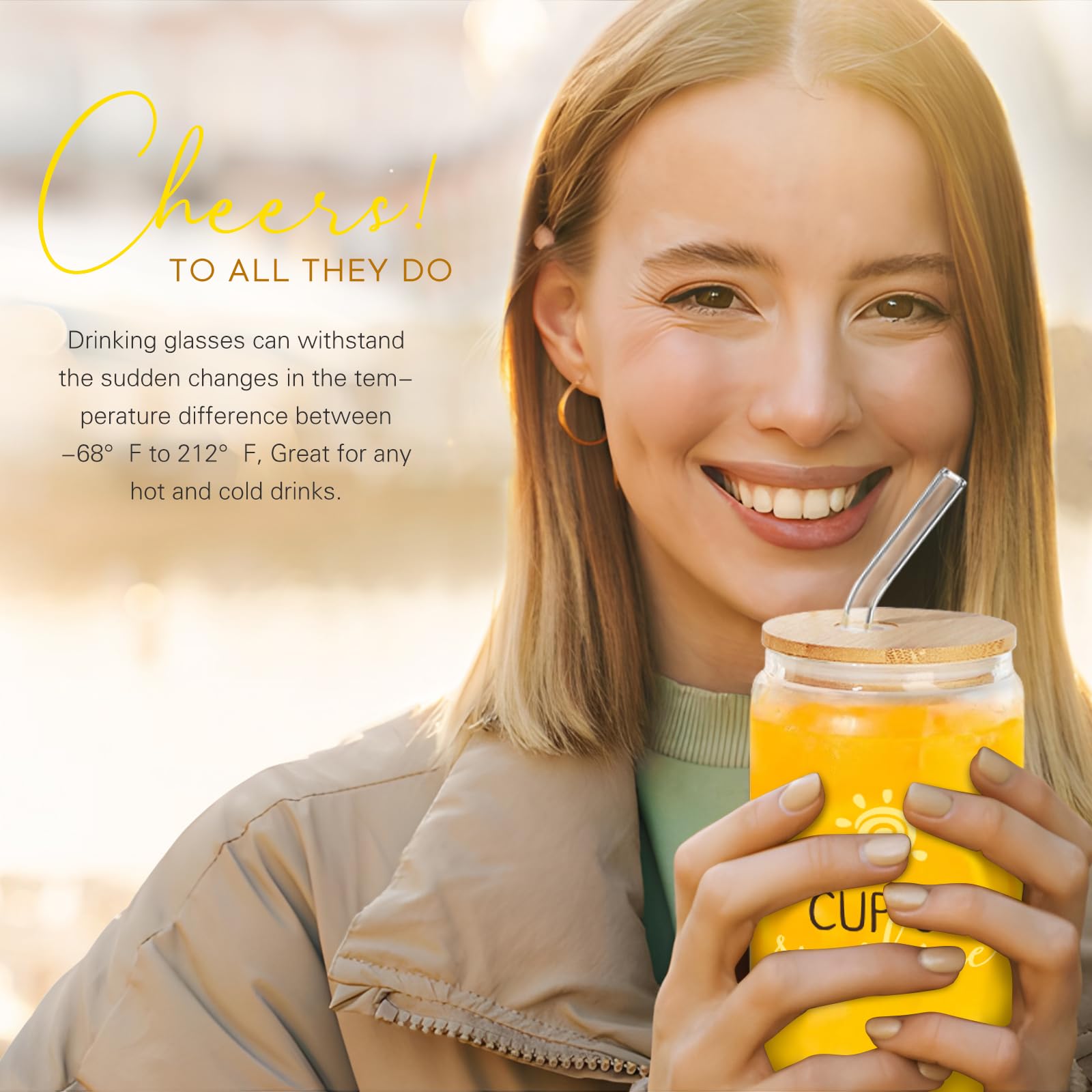 - SUNSHINE GLASS CUP: A stylish 16 oz drinking cup printed with "a cup of sunshine" is the way to happy sipping! The glass is made of high-quality thick transparent glass, smooth, lead-free, crystal clear, and can withstand -68°F to 212°F The temperature difference between the two (dishwasher safe), she can DIY her favorite drinks, such as iced coffee, soda and juice, etc., also includes the lid, cup sleeve, straw and straw brush, provide her with everything for a pleasant drinking experience!