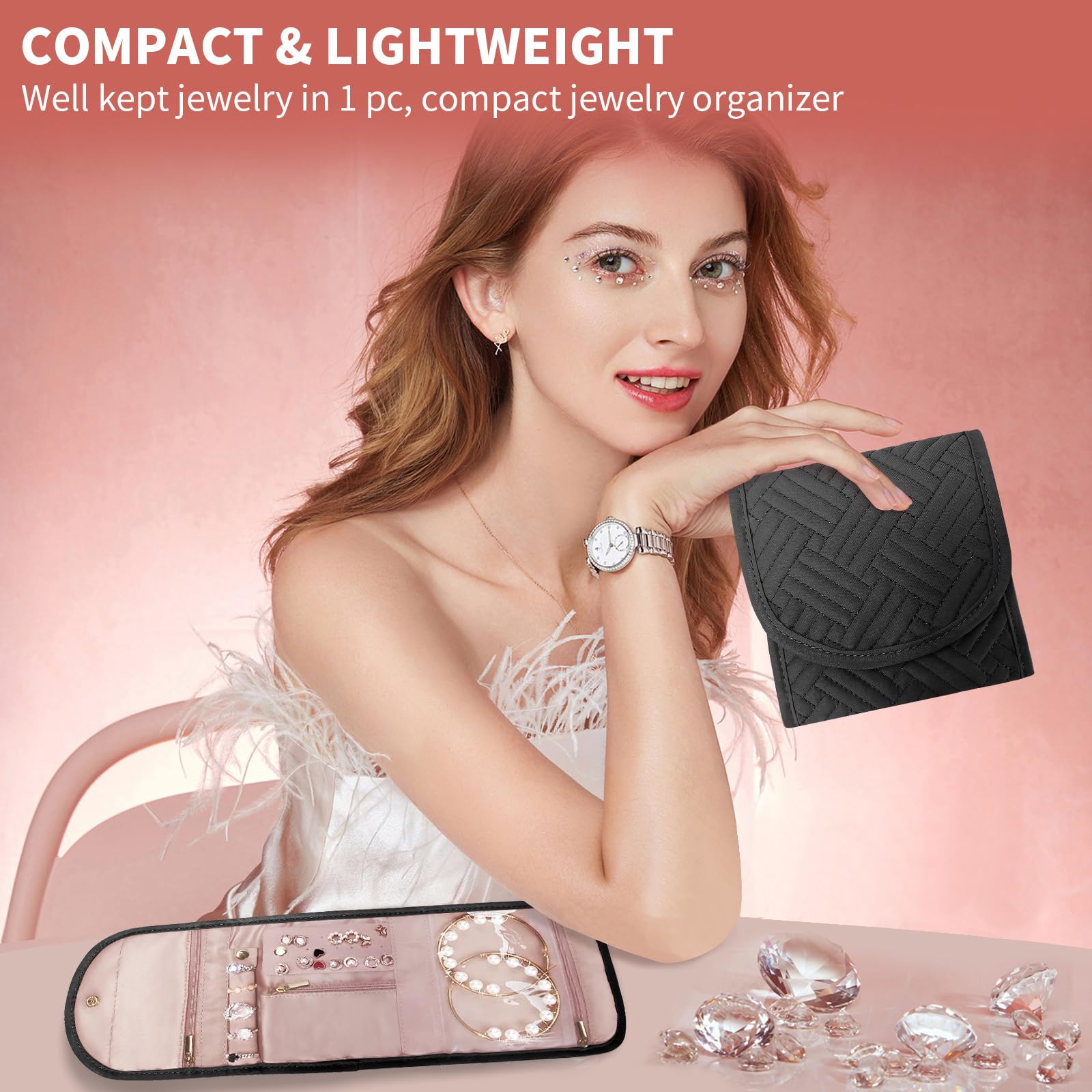 SUNRISING Travel Jewelry Organizer Case for Women, Foldable Jewelry Roll Pouch Bag with Portable Design for Journey Rings, Necklaces, Earrings, Bracelets, Mini - Black