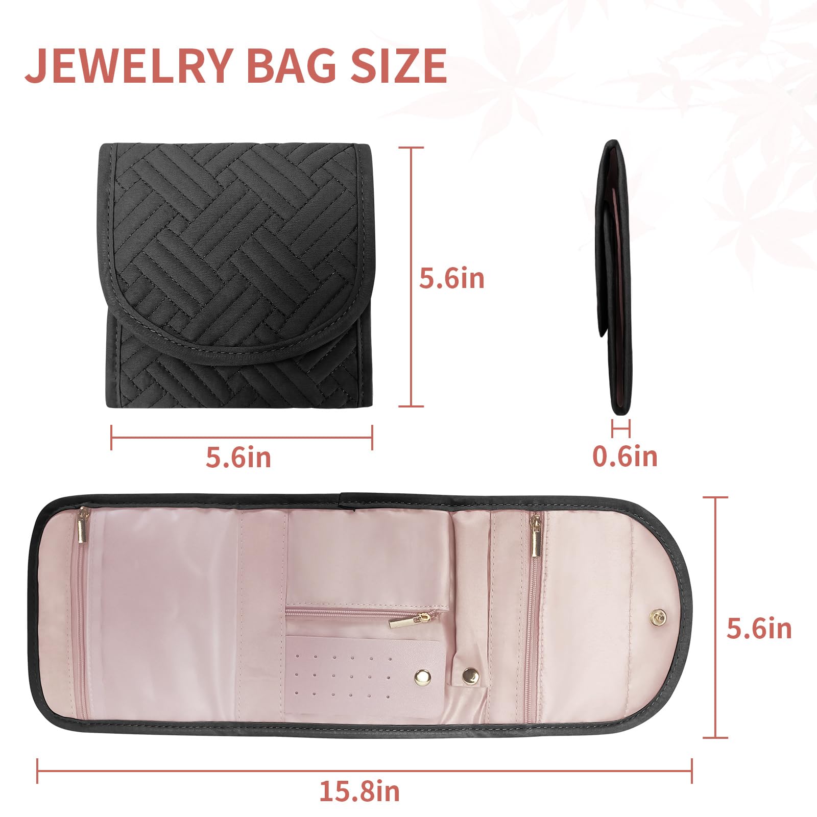 - Compact Size - Dimension:Foldable jewelry roll pouch bag size is about 5.6*5.5*0.6 inches, lightweight quilted cotton material, easy to tuck into suitcase,handbag, travel without taking up space.