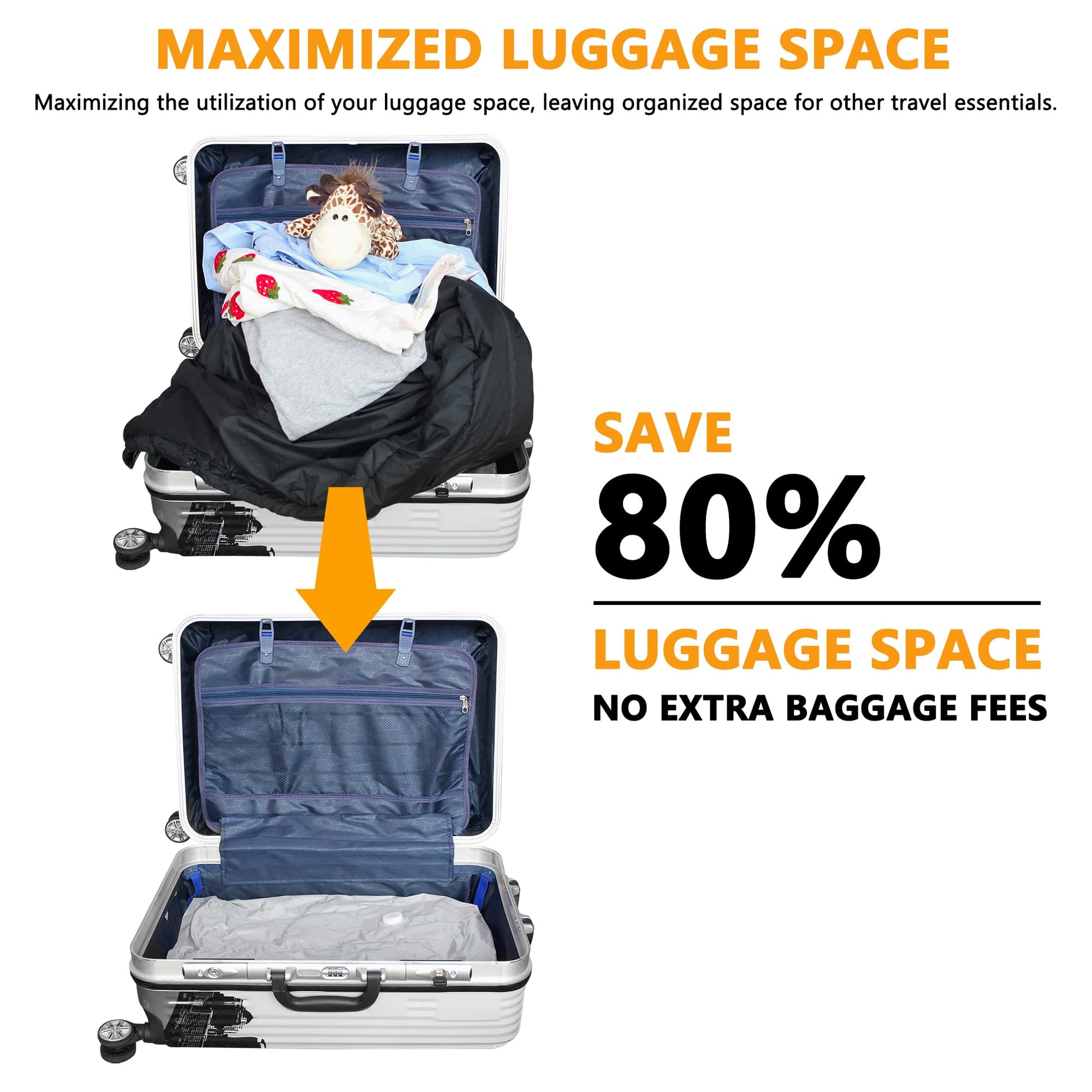 - Maximized Luggage Space: No extra baggage fees, Save 80% on clothes storage space with vacuum seal compartment. Not only maximizing the utilization of your luggage space but also leaving organized space for other travel essentials.