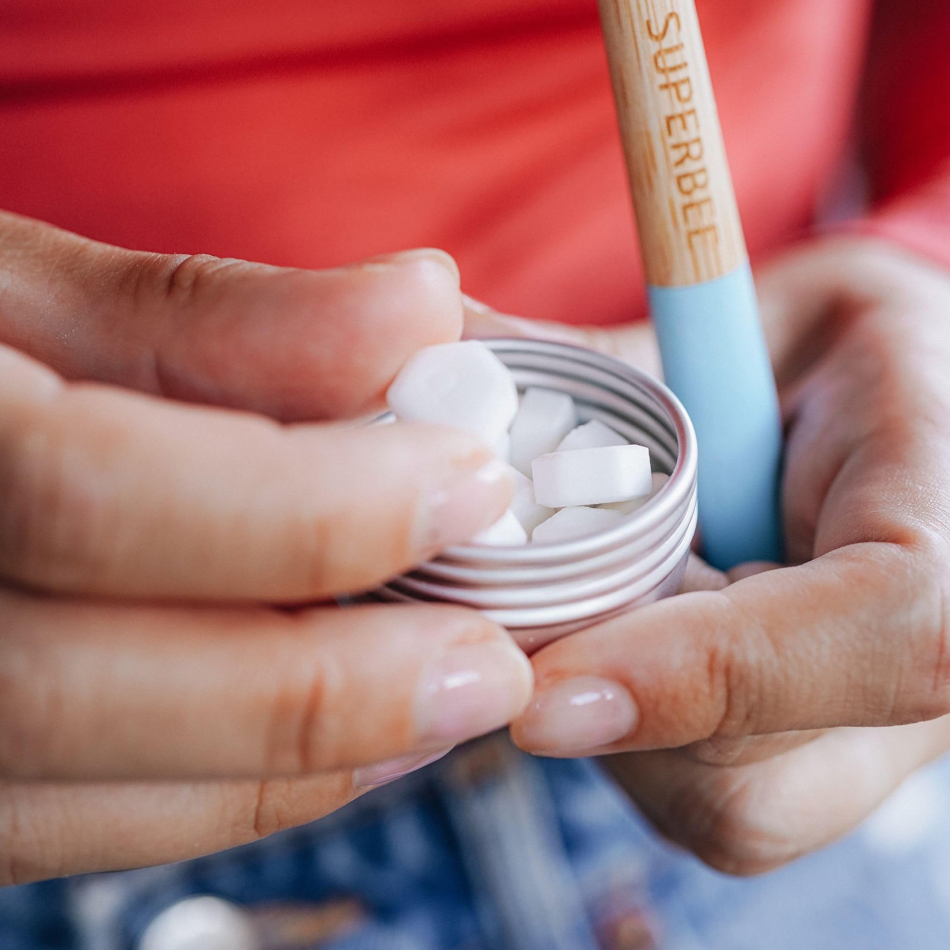 - FLUORIDE - FREE 14 TOOTHPASTE TABLETS - Spearmint mouthwash tablets made with natural ingredients. Chewable toothpaste fluoride free so as not to damage your teeth and gums. SuperBee cares about your dental health!