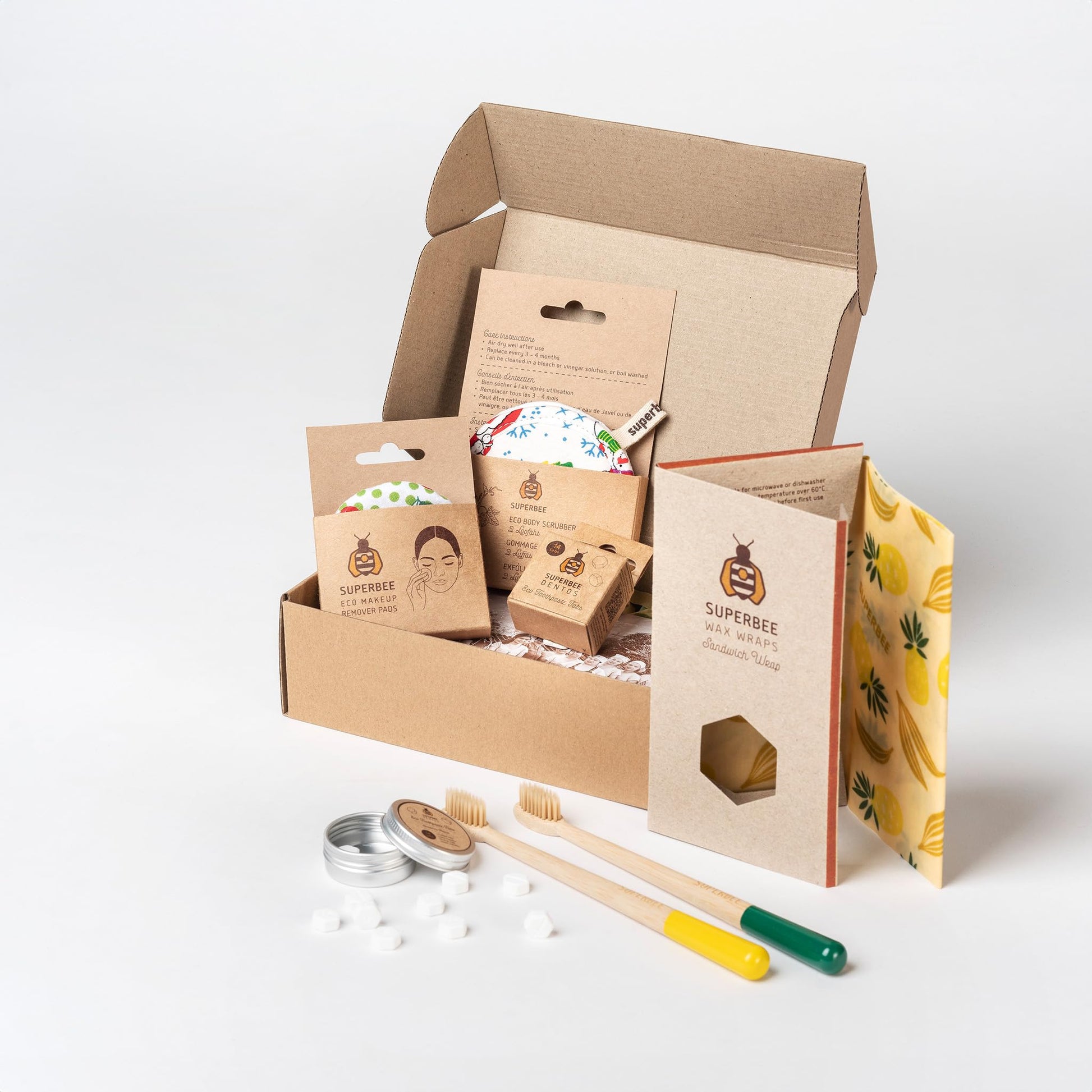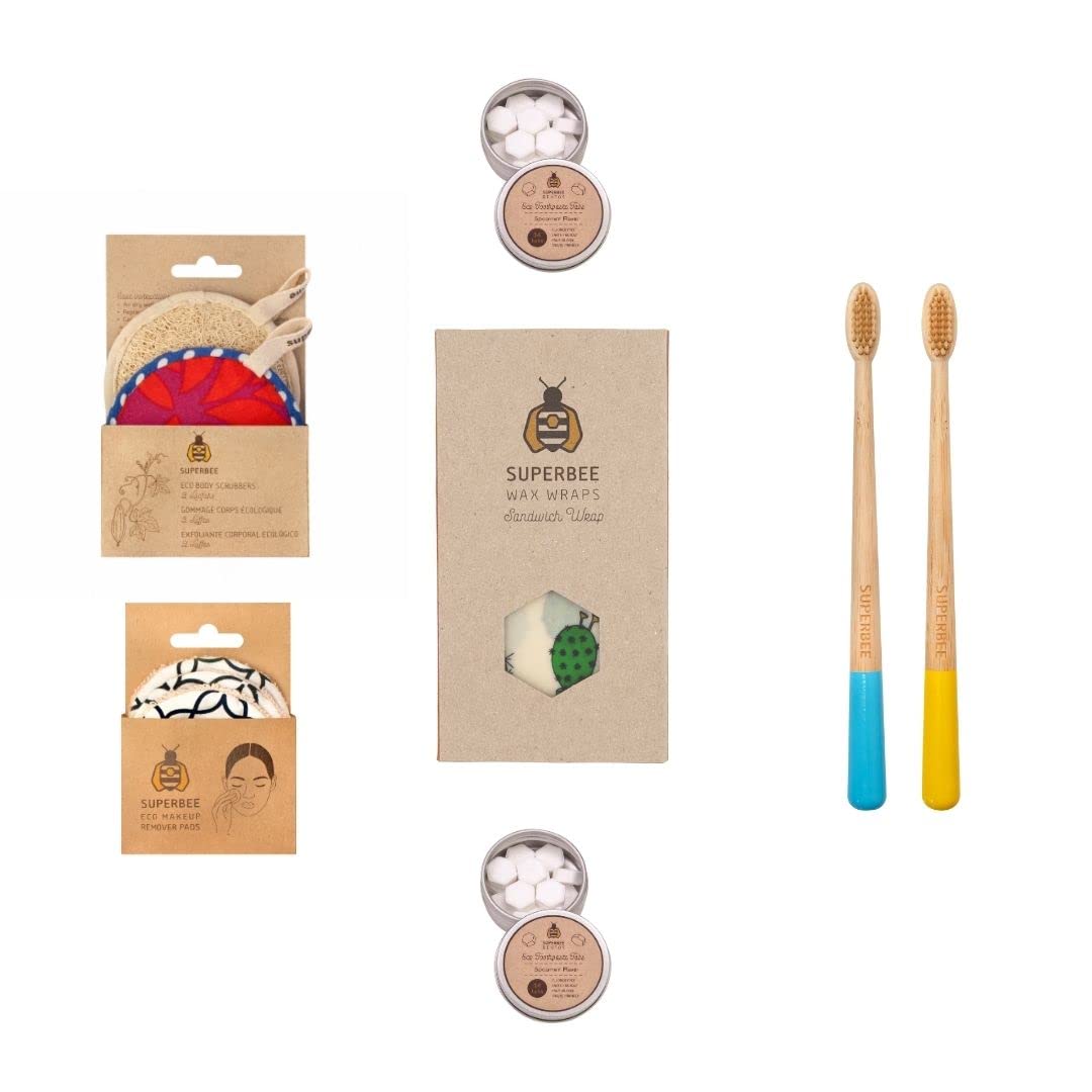 Details: SuperBee Women Gift Box - Toothpaste Tablets, Natural Body scrubbers, Soft Bristles Bamboo toothbrushes, Make up Removal Pads, Beeswax wrap - Eco Friendly Gift, Housewarming Gift Christmas Women Day …