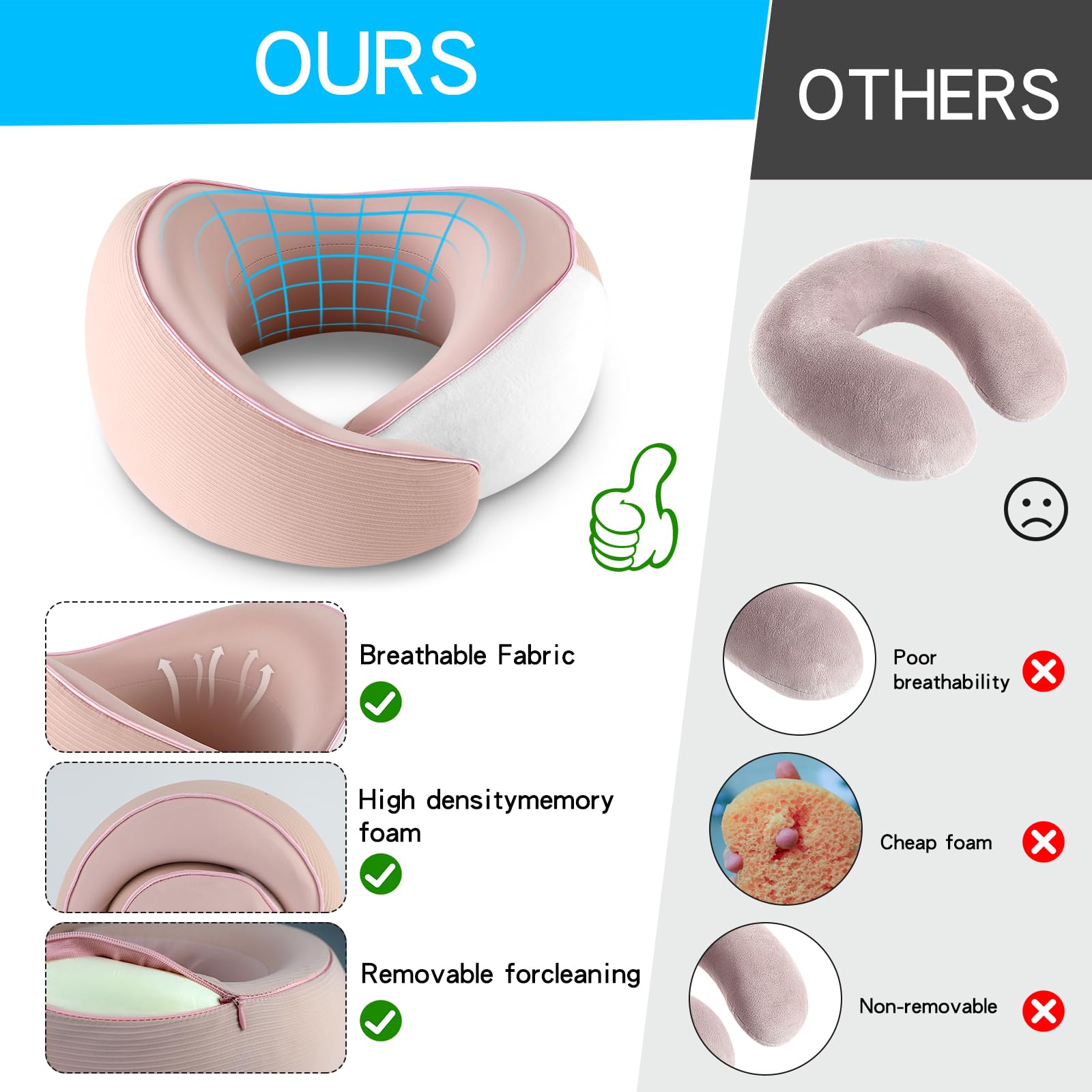 - High-Quality Memory Foam Core: Our U-Shaped Travel Pillow features a premium memory foam filling that molds to the shape of your neck and shoulders, offering personalized support. The slow-rebound technology ensures the pillow retains its original form, providing consistent comfort and stability for long-term use.