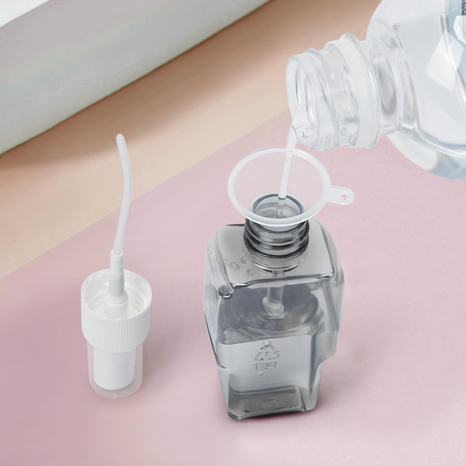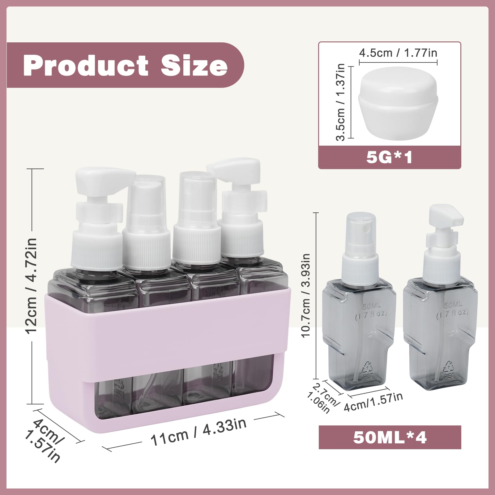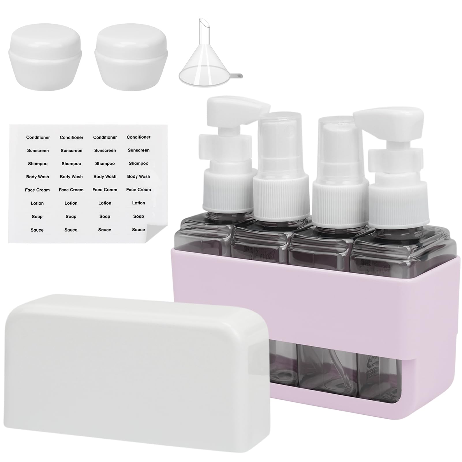 - 3. All-in-One Travel Kit for Every Liquid Need 2 Spray Bottles: For toners/alcohol-free sprays 2 Lotion Pumps: Perfect for thick creams/sunscreen Includes: 1 Mini funnel, 32 labels, 2-slot organizer case