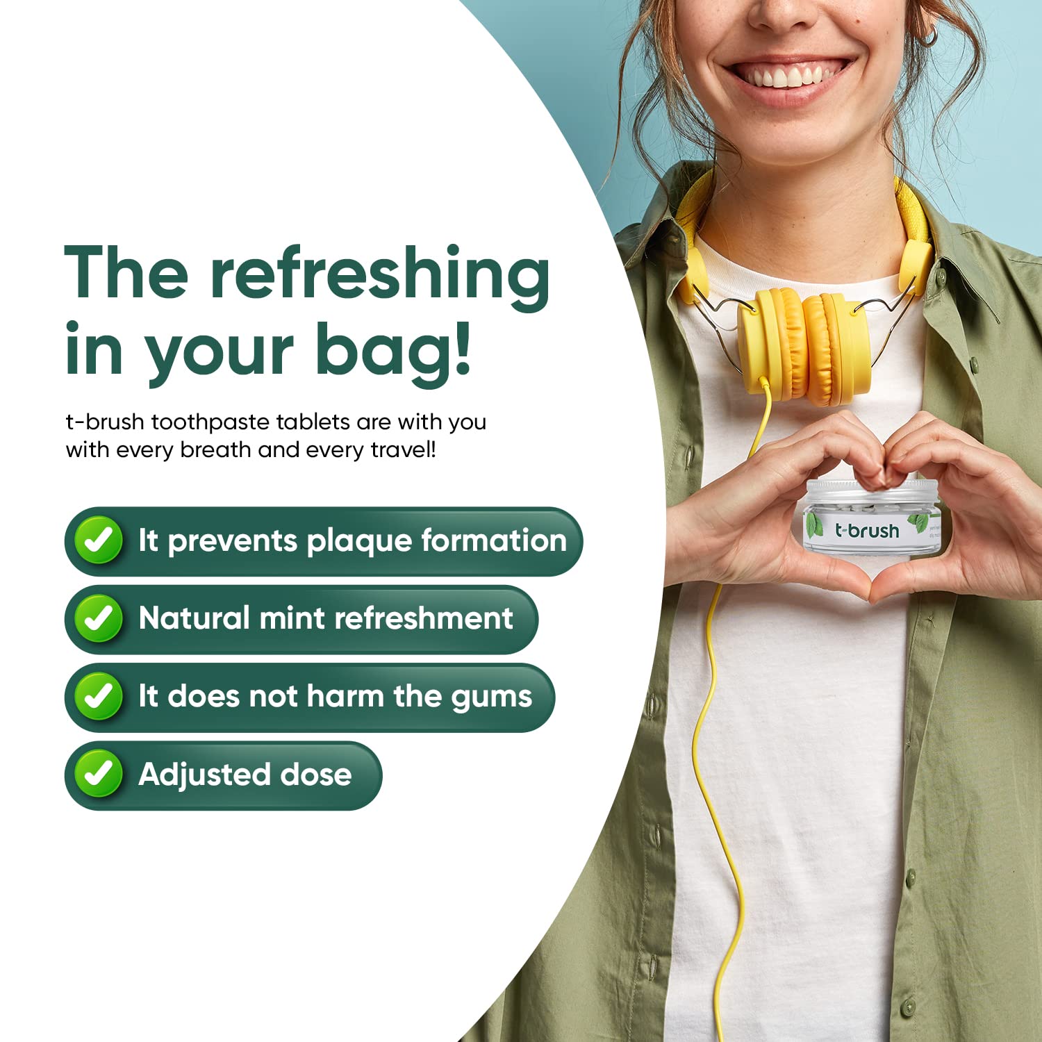 - IDEAL FOR TRAVEL : If you travel often and love camping, keeping your teeth clean and breathing fresh can be difficult and sometimes impossible to carry toothpaste. Thanks to T-brush toothpaste tablets, you can get rid of these troubles.
