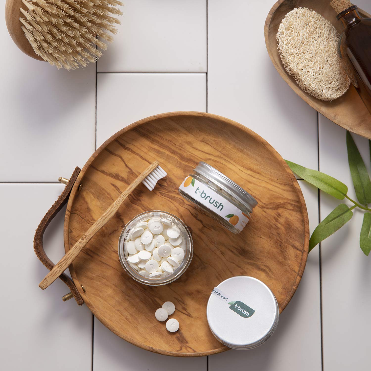 - NATURAL AND VEGAN TOOTHPASTE TABLETS: TBrush toothpaste tablets are free from SLS, and Gluten.With Eco Friendly Packaging and reusable glass bottle.
