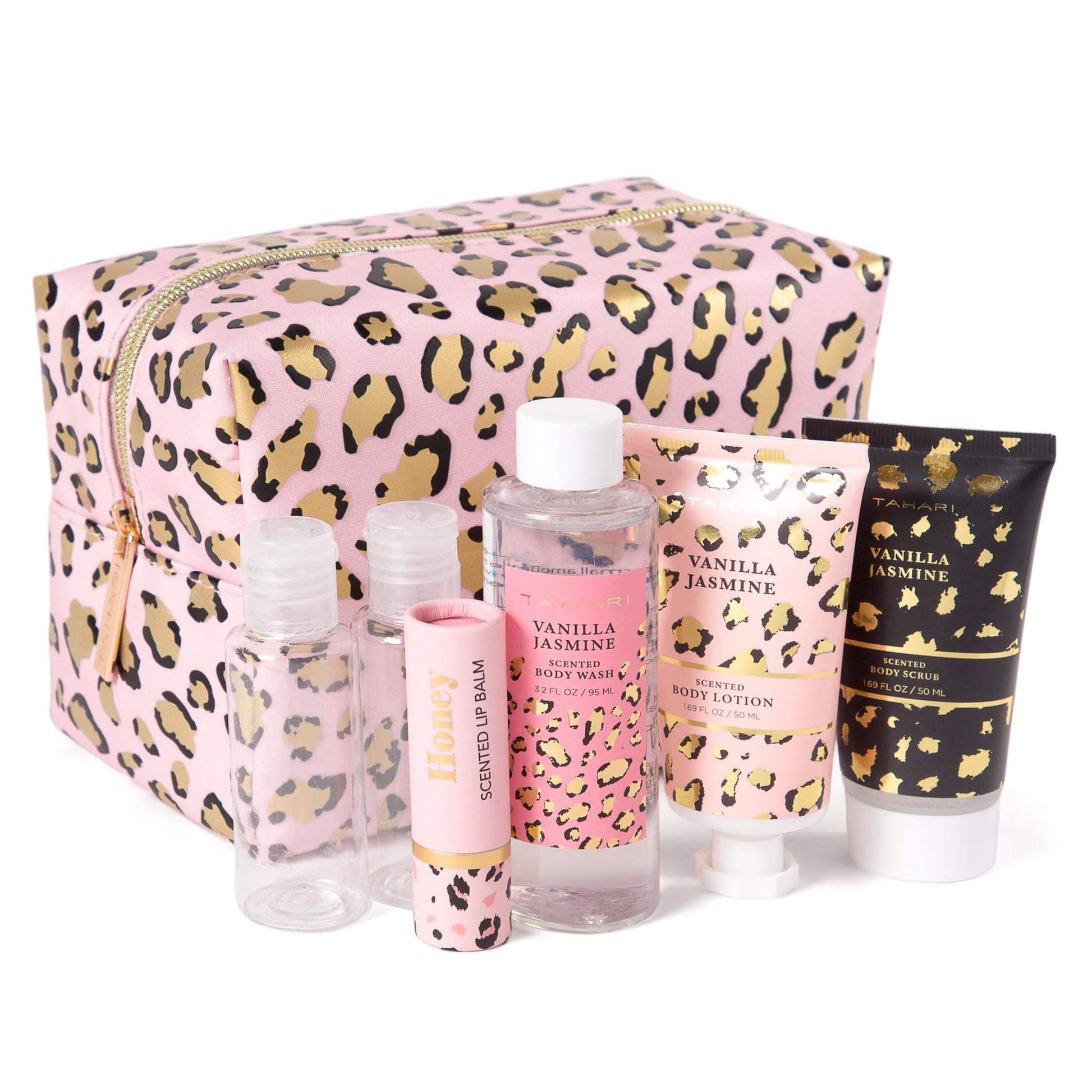Tahari Vanilla Jasmine Spa Gift Set for Women – Luxurious Bath Kit with Body Lotion, Body Scrub, Body Wash & Lip Balm with Bag – Perfect Selfcare Gifts for Women (Leopard)