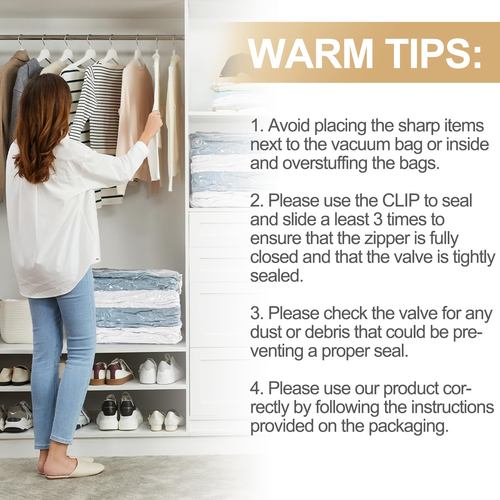 - Meets Different Requirements: Our jumbo vacuum storage bags are made of strong material to meet various purpose such as bedroom storage, moving storage, college dorm room essentials storage closet organizers and storage. It will be more convenient to seal the space saver vacuum storage bags by using the CLIP in the bags