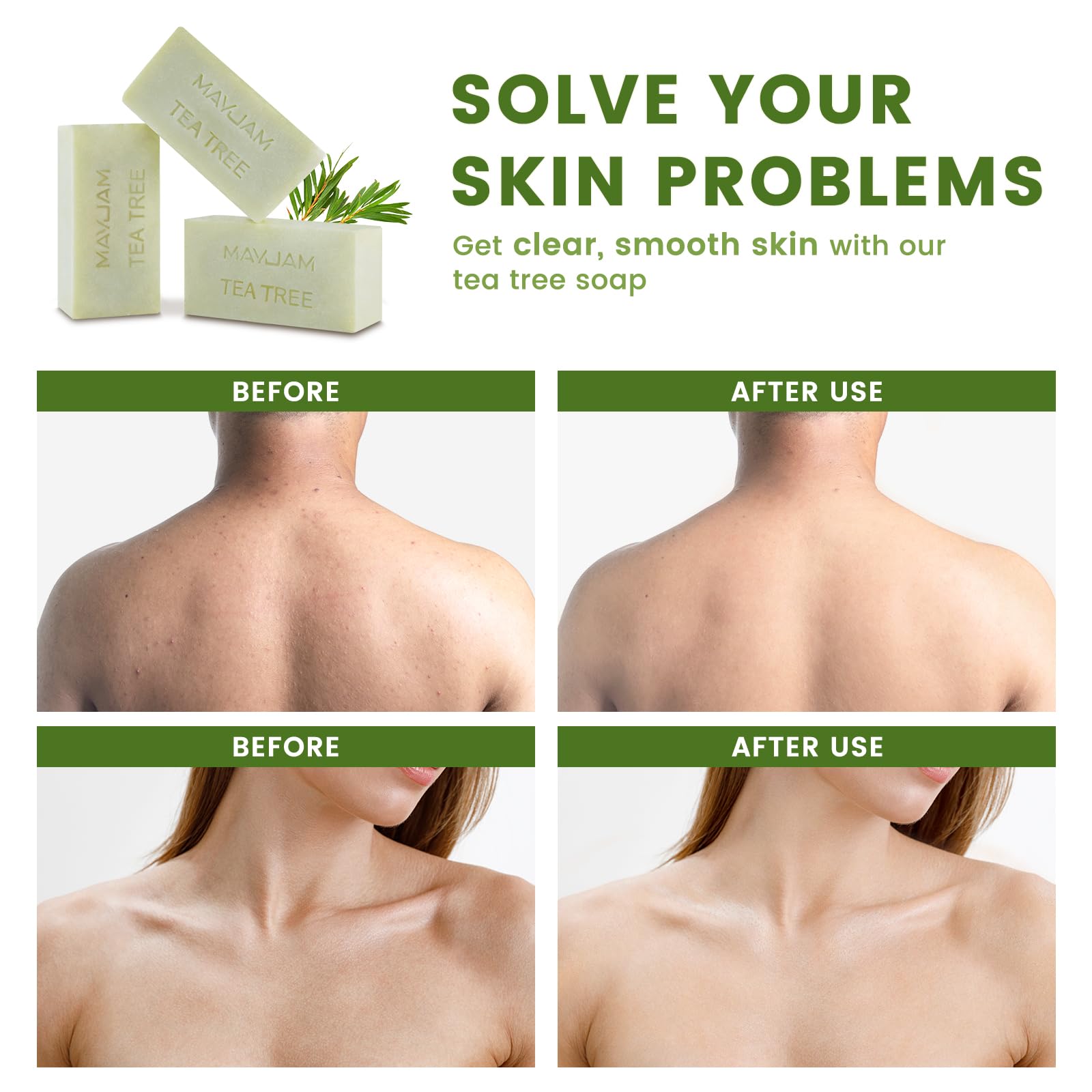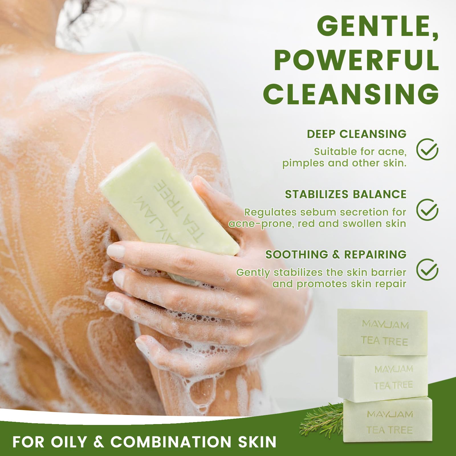 - Deeply Cleansing & Purifying Formula: MAYJAM tea tree soap is infused with natural Tea Tree oil, renowned for its powerful cleansing properties. This formula works to deeply clean your skin, washing away dirt, excess oil, and impurities without over-drying, leaving your skin feeling thoroughly refreshed and revitalized. The natural ingredients in the product make our tea tree soap ideal for Antifungal Antibacterial Treatment for face & body acne, athlete's foot, tinea, folliculitis ringworm, jock itch, ect.