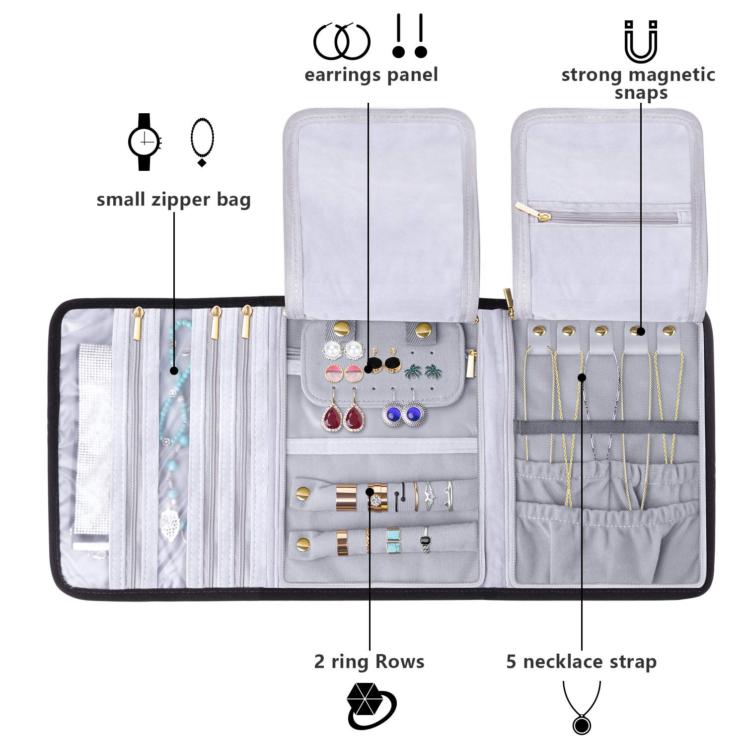 - HIGH CAPACITY: 2 rows with snap to store your rings, A detachable ear stud holder for 9 pairs earrings or eardrop, 5 zipper pockets(3 transparent) for your precious items, like bracelets, necklaces, watch, pendant, brooches and more.