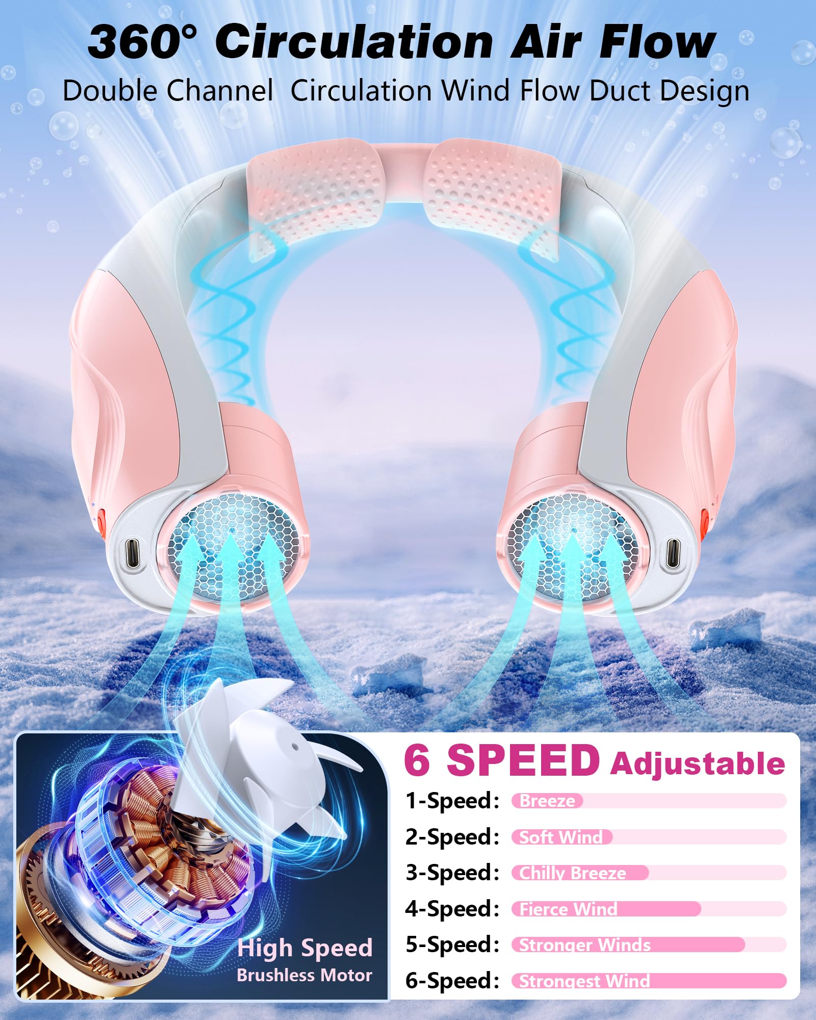 - 6000mAh Long-Lasting Battery: Say goodbye to battery anxiety—this hands-free neck fan is equipped with a robust 6000mAh battery that delivers up to 20 hours of continuous cooling on a single charge. With a fast dual USB-C charging system, it fully recharges in just 5 hours. Ideal for travel, long workdays, summer festivals, or workouts—stay cool wherever you are.