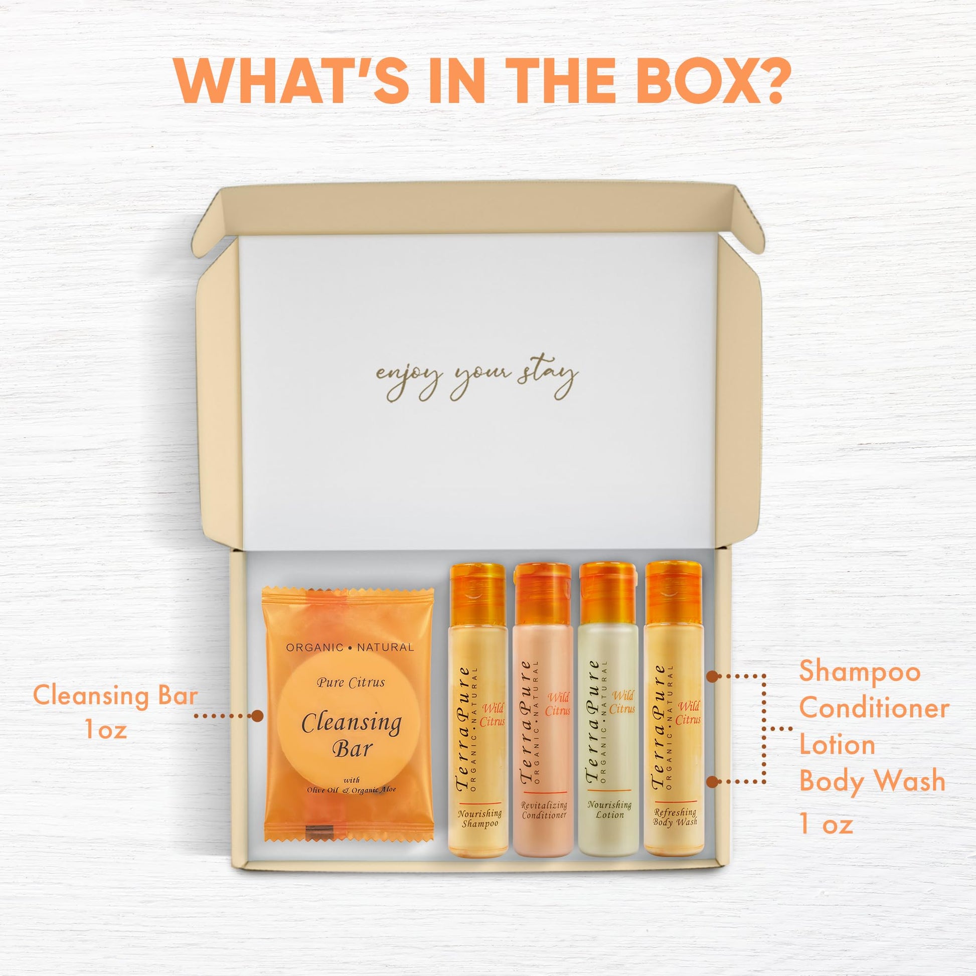 Terra Pure Amenity Kit | Boxed Hotel Toiletries Bulk Set | 1 oz Shampoo, Conditioner, Lotion, Body Wash & Cleansing Bar | 1 Set per Case