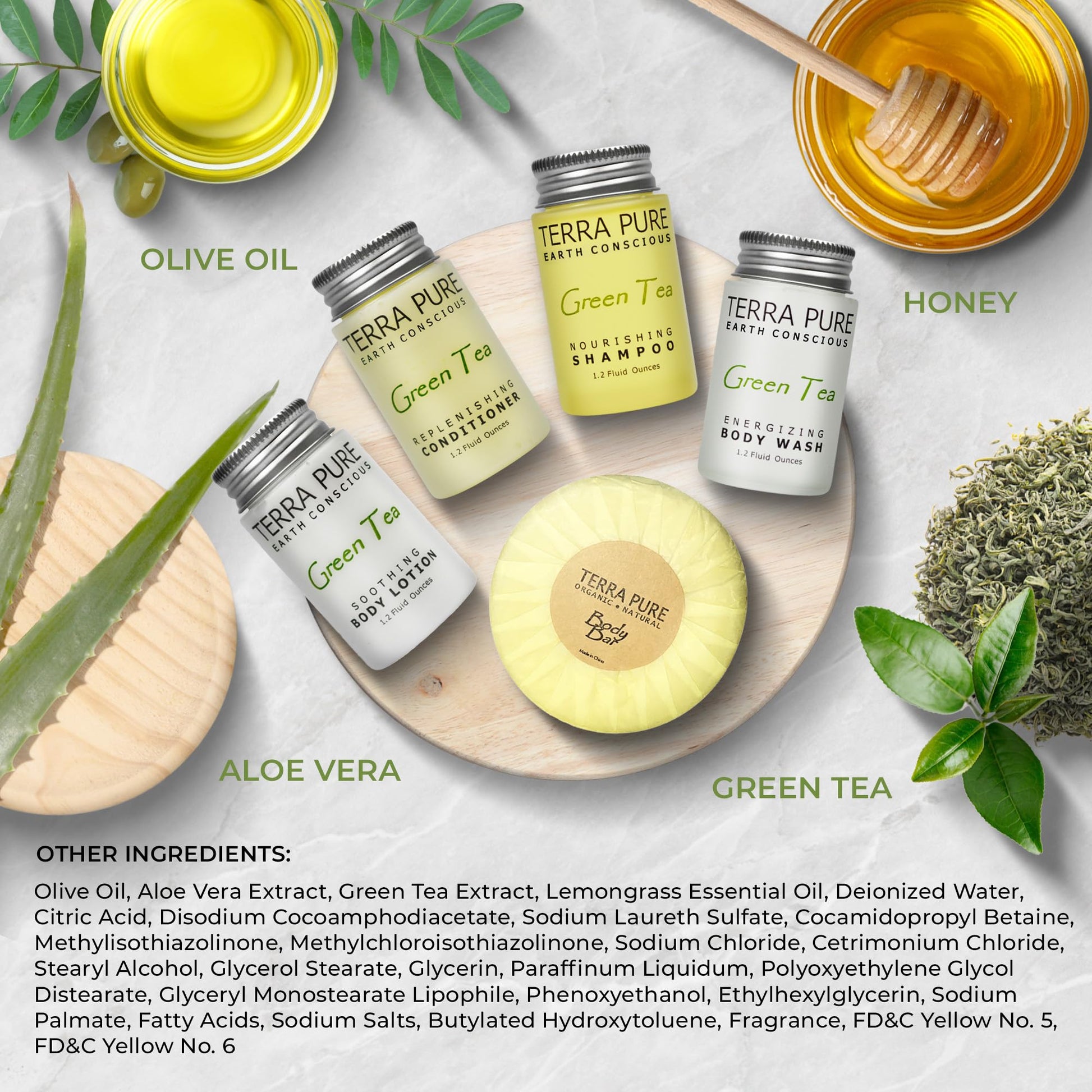 - WHY CHOOSE TERRA PURE? Our high-end formula & environmentally-friendly beautiful design bring elegance to any upscale property. These hotel toiletries are paraben-free, gluten-free & made with organic aloe, honey, & olive oil for soft skin & hair!
