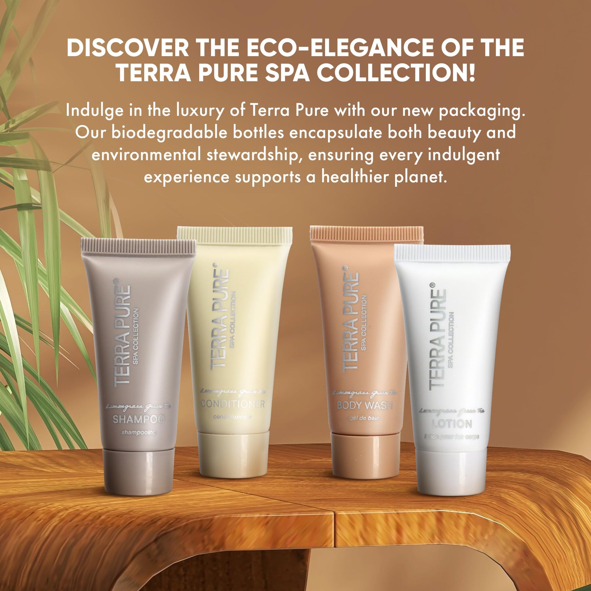- ECO-CONSCIOUS LUXURY AMENITIES: Experience eco-luxury with our Terra Pure hotel amenities. Formulated for your hair and skin, these travel-size toiletries are perfect for hotels, gyms, care packages, vacation rentals, guest rooms, and cruise ships. Each item, from the sleek, brown-decor-complementing bottles to the degradable material and leak-preventing foil seal, is crafted for environmental friendliness without compromising on style or convenience.