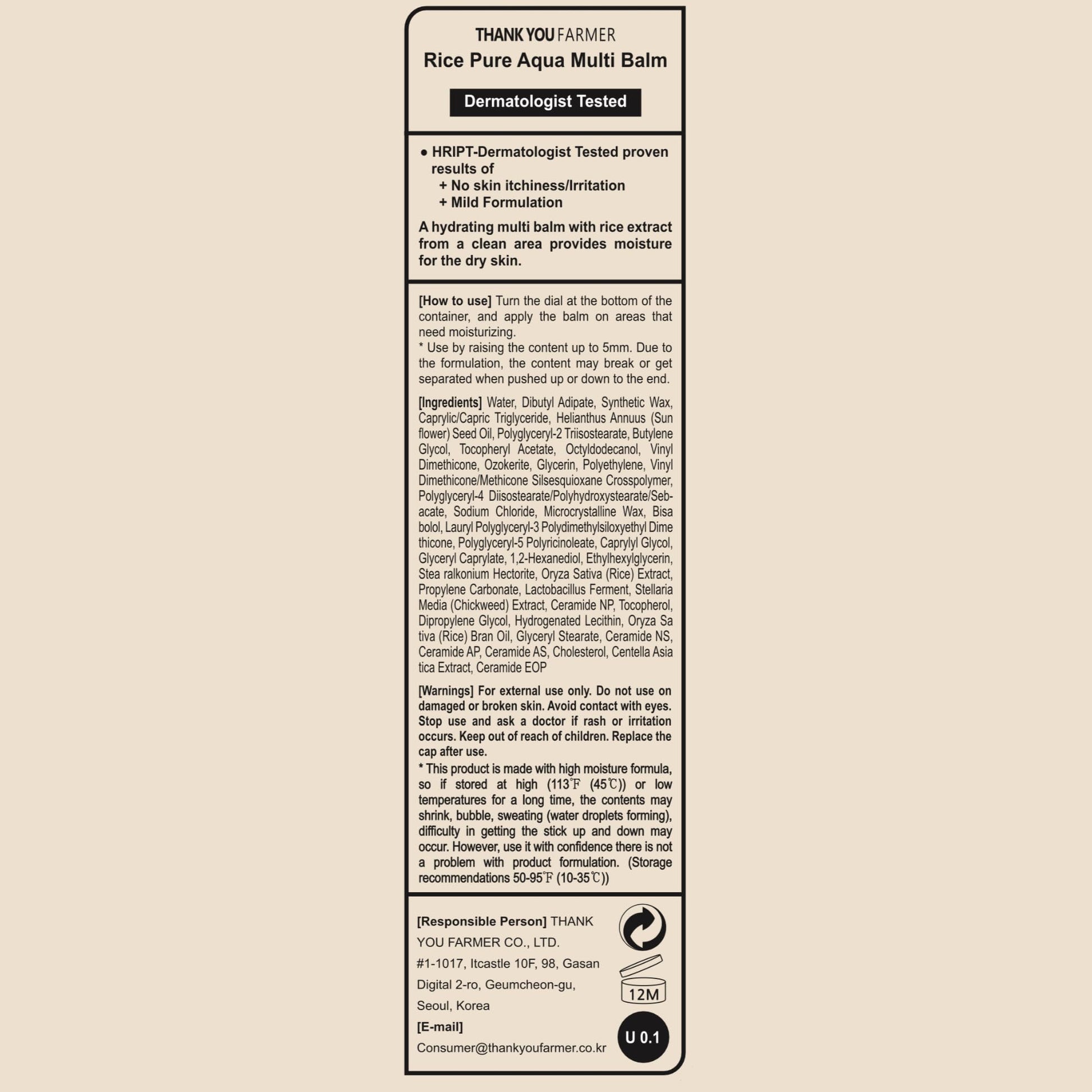 THANKYOU FARMER Rice Pure Aqua Multi Balm - Exclusive Korean Rice Extract, 5 Ceramide, Eye Treatment Balm, Korean Multi Balm Stick for Face, Fragrance-Free