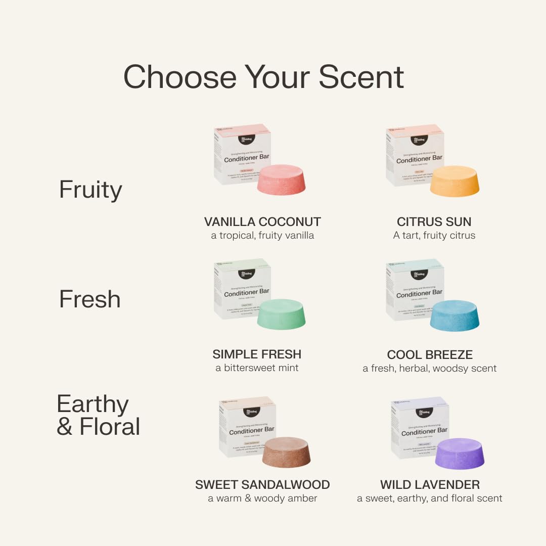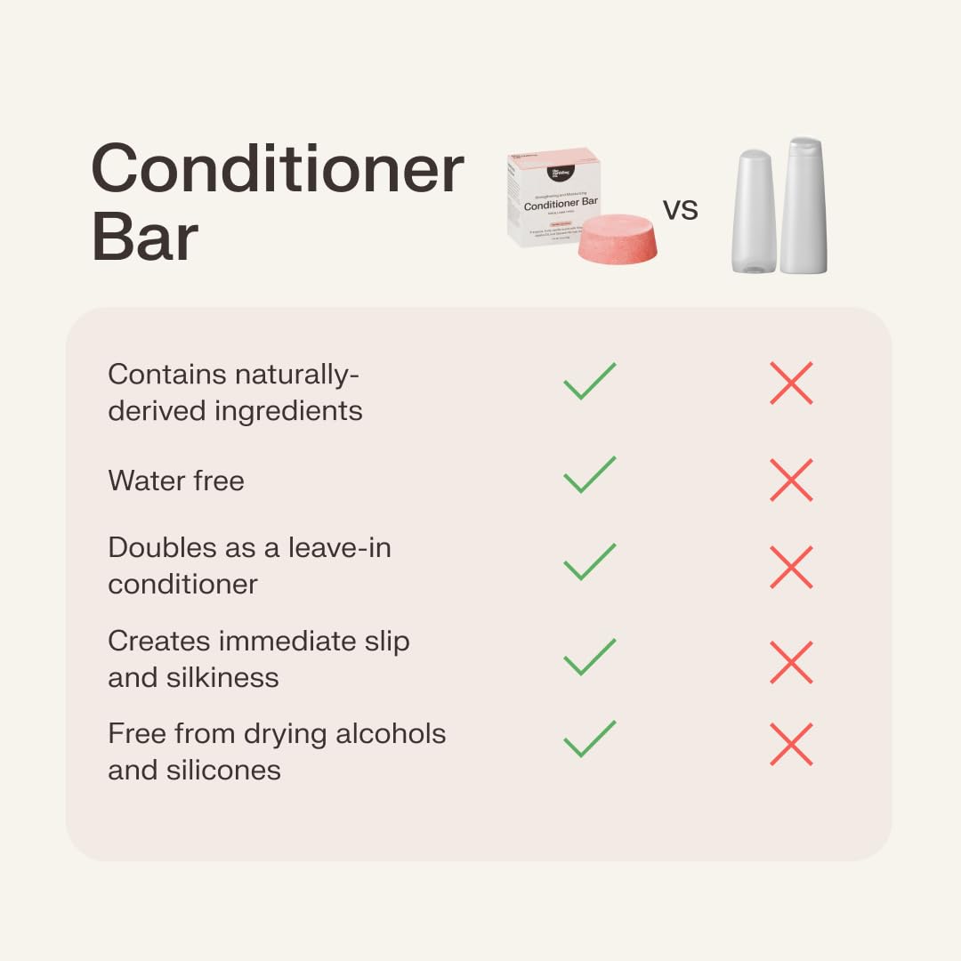 Details: THE EARTHLING CO. CONDITIONER BAR: Experience improved hair health with more moisture, shine, and growth. Our bars create a slip similar to liquid conditioner that detangles the hair instantly while infusing it with hydration, moisture, and essential vitamins. Pro Vitamin B5 and Glycerin work like magic to strengthen hair and support new healthy hair growth while also drawing water into the hair follicle to lock in moisture and make your strands feel soft, shiny, and smooth. Rich in fatty acids, jojoba oil provides much-needed moisture and nourishment to scalp and strands without flattening or weighing hair down. Last but not least, our coconut oil, cocoa butter, and our conditioning agent, makes your hair silky, moisturized, and manageable while reducing frizz and flyaways. Our formula was designed to work with all hair types (curly, wavy, straight, gray, color-treated, dry, oily) which means it doesn't contain any sulfates, phthalates, silicones, parabens, artificial fragrances, or dyes â common ingredients that can wear down your hair or scalp health over time. Our formula is dermatologist reviewed and approved, and pH-balanced. Itâs safe for sensitive skin and comes in 6 different scents, including a fragrance-free option for those with extra sensitive skin. Our Strengthening and Moisturizing Conditioner Bar is easy to use: Wet your hair, "paint" the bar on your hair starting at the ends and working your way up. If you need scalp moisture, massage it into your scalp (or skip this part if your scalp get's oily fast), then rinse out completely. The Conditioner Bar formula is ligthweight enough to double as a leave-in conditioning treatment post-wash if you tend to experience try ends. Store the bars on a dish in the shower to allow them to fully drain, and your bars should last you 3+ months, replacing 2-3 plastic bottles. Our most popular subscription frequency is 3 months and is ideal for those who wash their hair 2-3x per week.