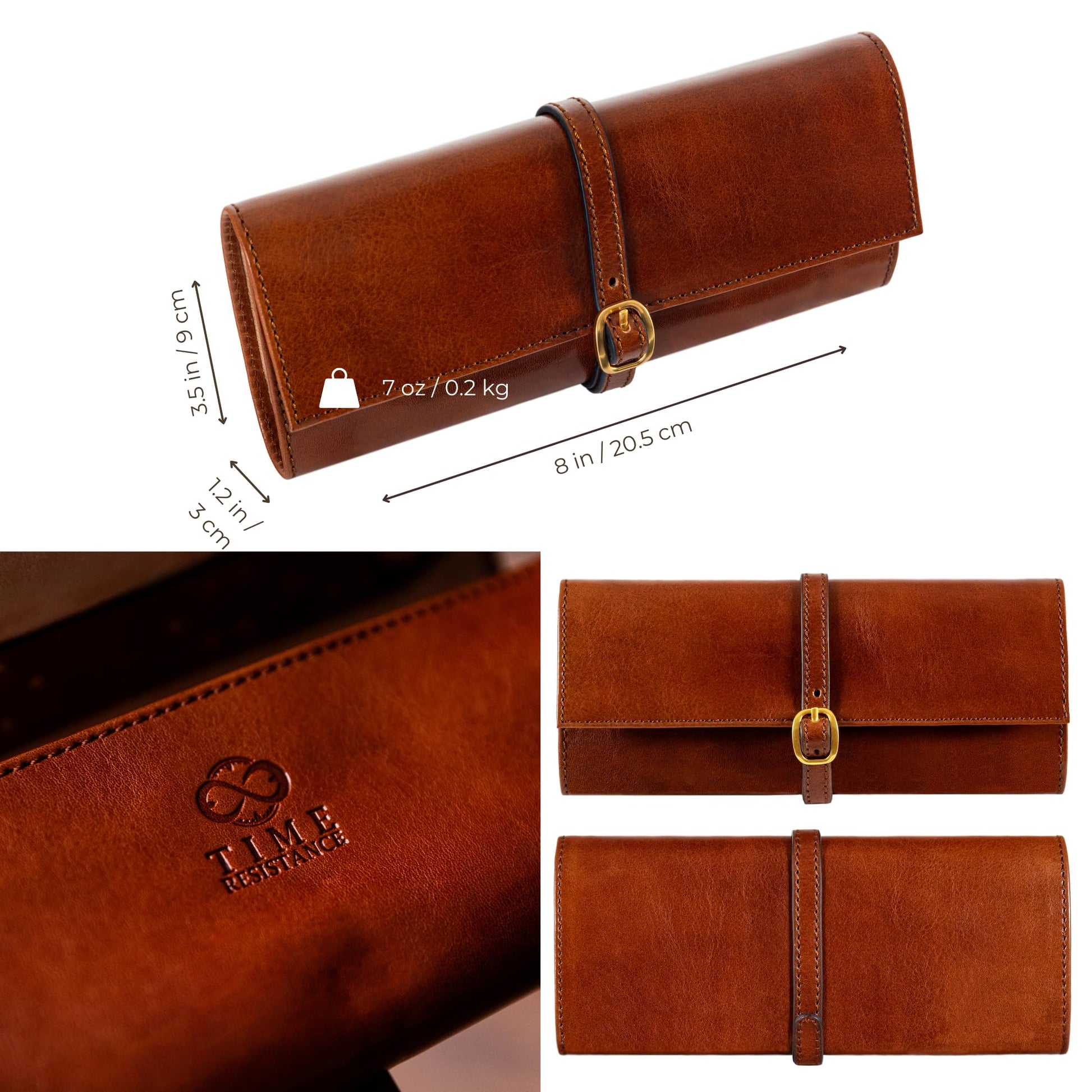 Time Resistance Leather Jewelry Roll - Full Grain Leather Travel Jewelry Case - Jewellery Organizer Made in Italy (Cognac Brown)